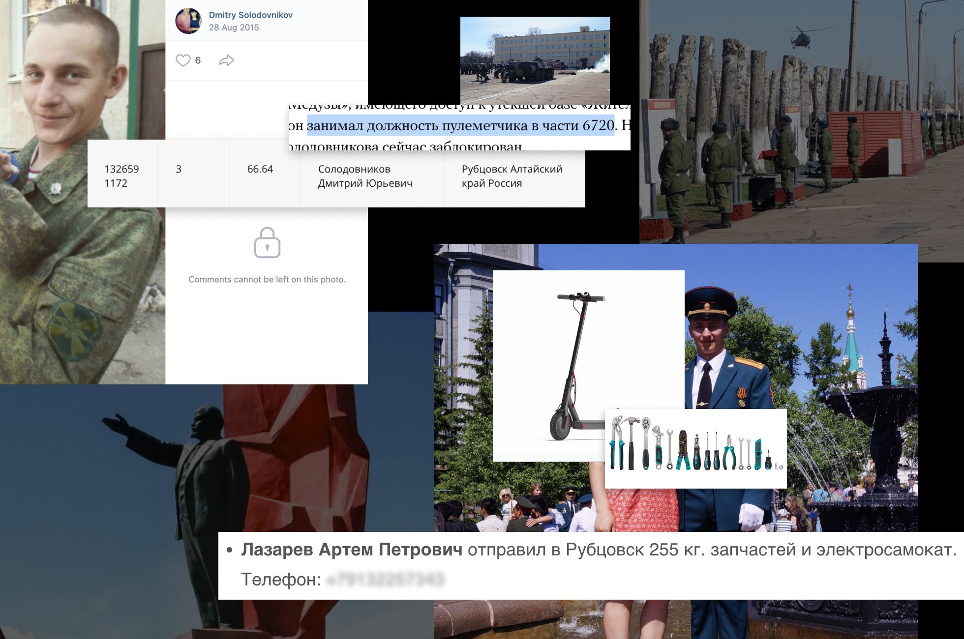 Некоторые отправители посылок из Мозыря не скрывают своей связи с армией. На их страницах в соцсетях, которые «Медузе» удалось найти, сопоставляя выдачу из внутреннего поиска «ВКонтакте» с публикациями «Беларускi Гаюн» и «Базы данных», а также с чеками СДЭК, можно заметить фотографии в военной форме. Например, Дмитрий Солодовников, предположительно отправивший три посылки общим весом 66 килограмм, выкладывал во «ВКонтакте» свою фотографию, на которой можно разглядеть полевой шеврон внутренних войск. В профиле указан город проживания — Рубцовск. Судя по данным базы «Жители России», в 2020 году он занимал должность пулеметчика в части 6720. Номер телефона Солодовникова сейчас заблокирован.