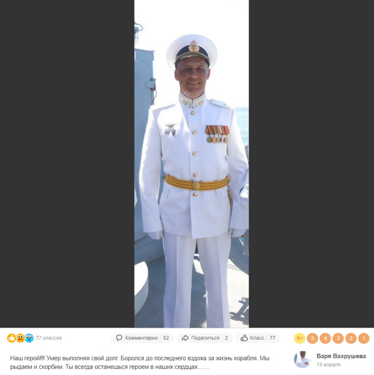 Так, «Схемы» нашли пост в социальной сети «Одноклассники» женщины по имени Варвара Вахрушева. Она сообщила, что ее муж погиб во время «выполнения своих обязанностей». На фото – мужчина, одетый в офицерскую форму Военно-морских сил РФ, с погонами мичмана.