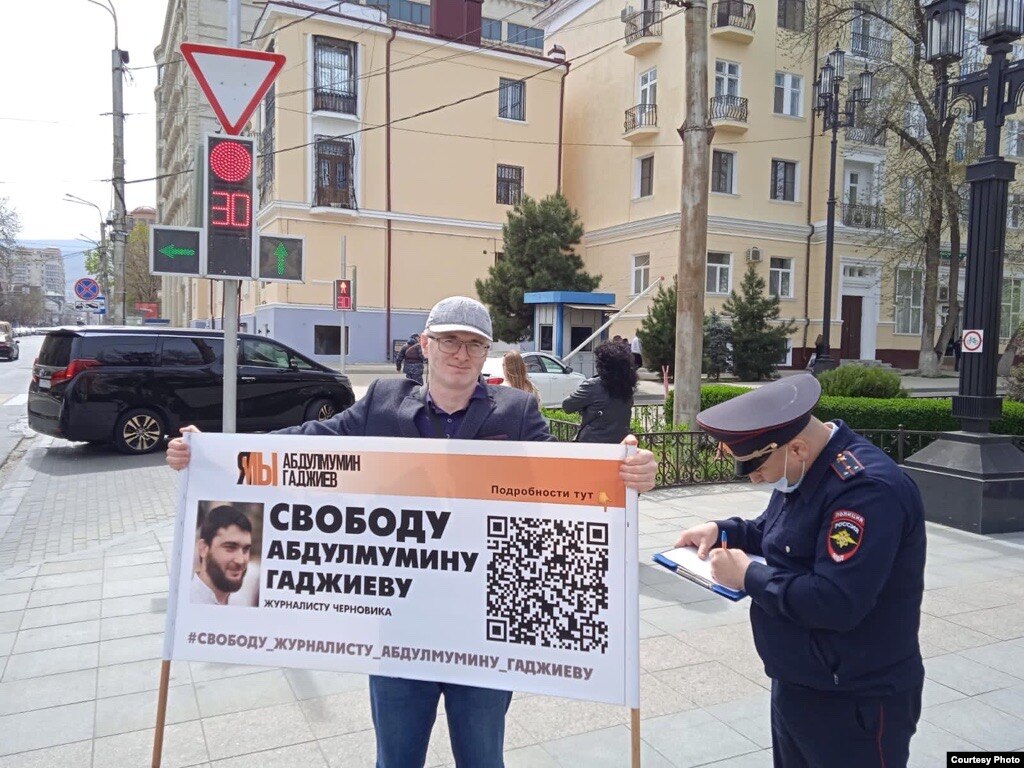 В Махачкале прошли одиночные пикеты против преследования обвиняемого в финансировании терроризма журналиста Абдулмумина Гаджиева и других политических заключенных.