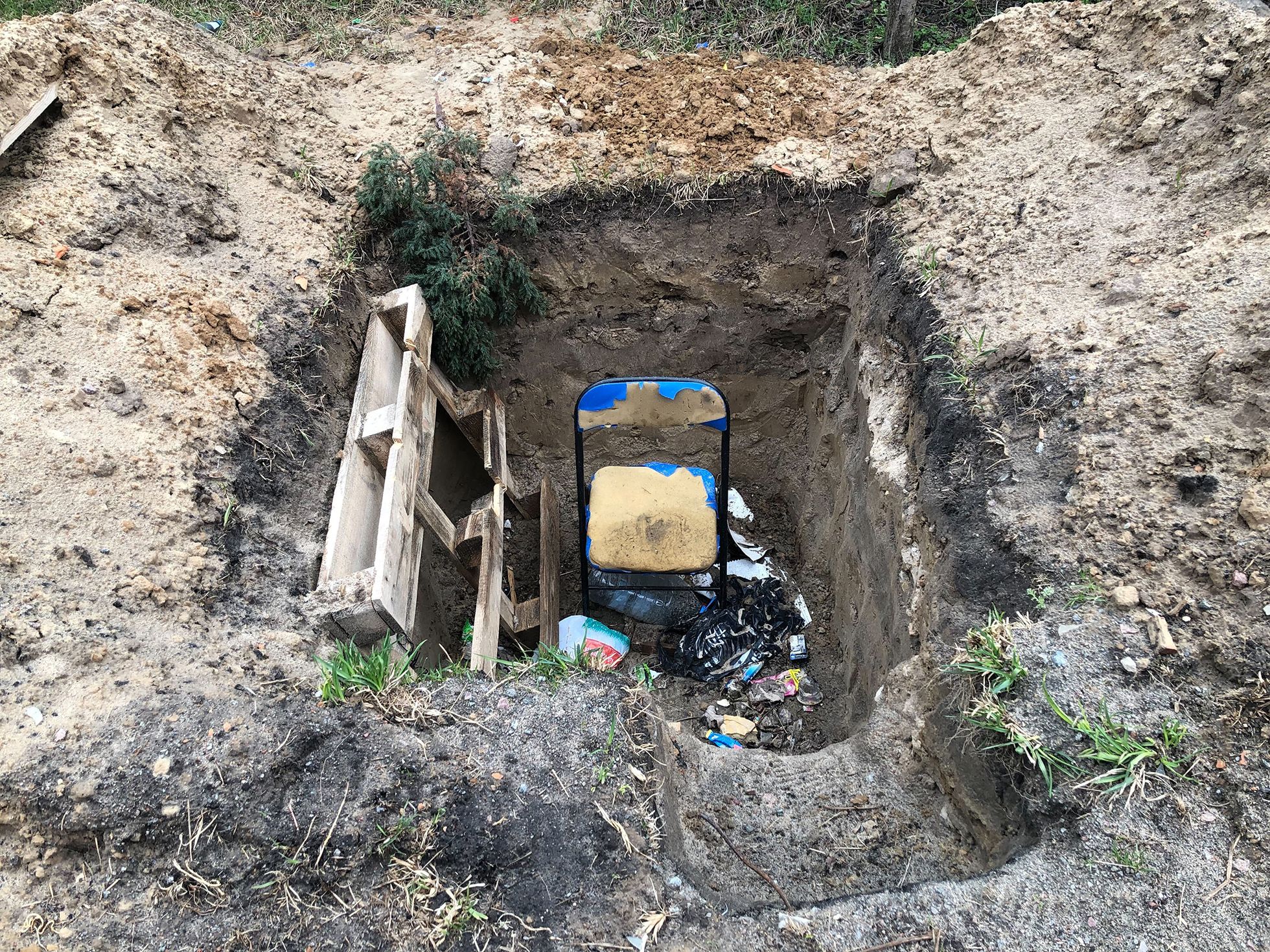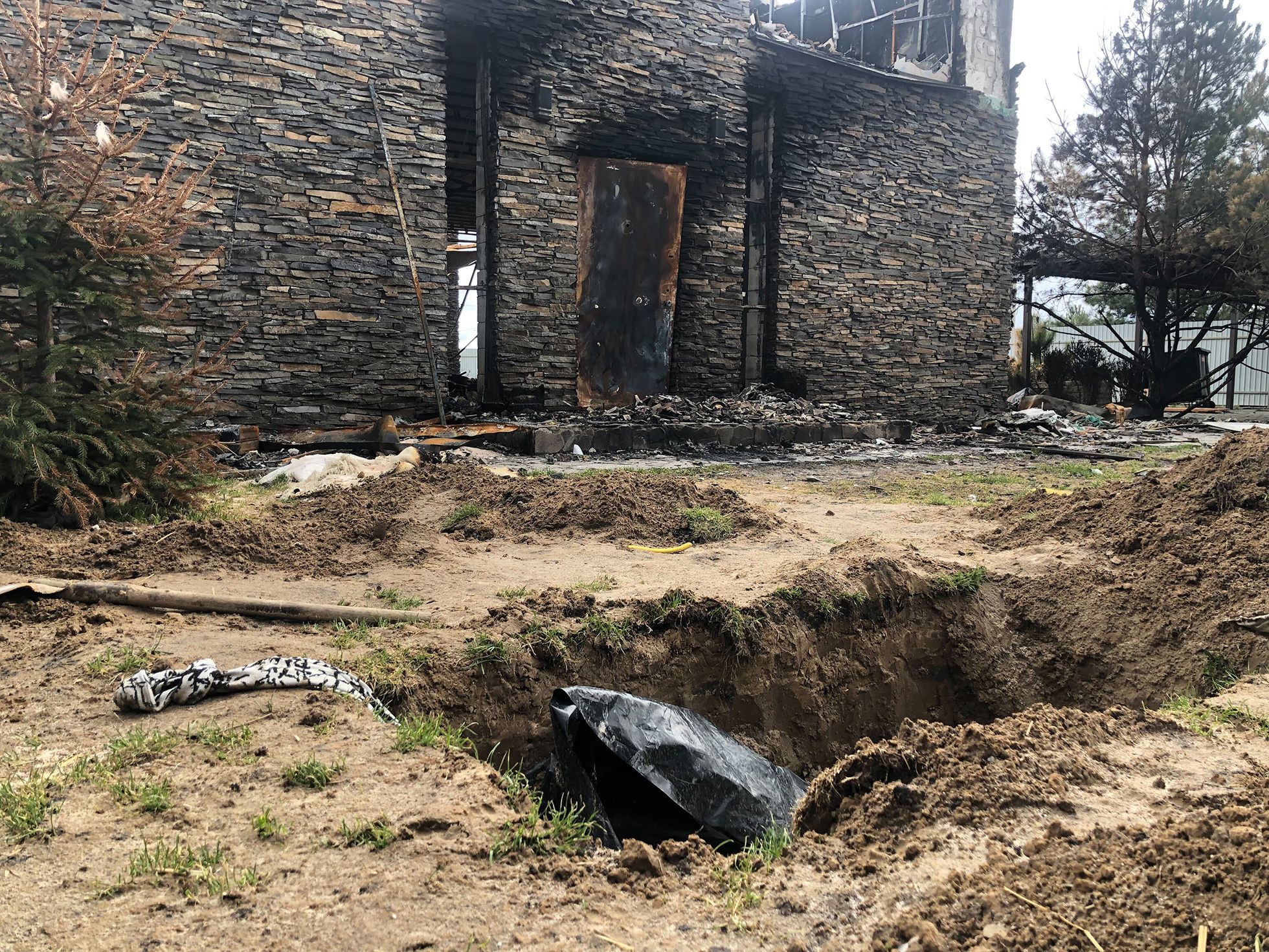 Сразу за разрытой могилой пустует большая собачья клетка. Животных в доме больше нет; на газоне лежит труп щенка. У Евгении и Алексея было два взрослых алабая и девять щенков, рассказывает она «Медузе». До войны, рассказывает Евгения, они с Алексеем собирались закончить работы на участке — там уже выкопали яму под пруд. Муж хотел отправиться в путешествие на мотоцикле по Западной Украине и купил экипировку: палатки, спальные мешки и посуду (на которой семья в итоге готовила себе еду во время оккупации). «Посмотрите, что они оставляют после себя, — Евгения показывает фотографии пепелища. — У нас была счастливая жизнь с кучей планов, а теперь я с ребенком черт знает где, не могу собрать себя в кучу и понять, как жить с этим. Они все должны быть наказаны».