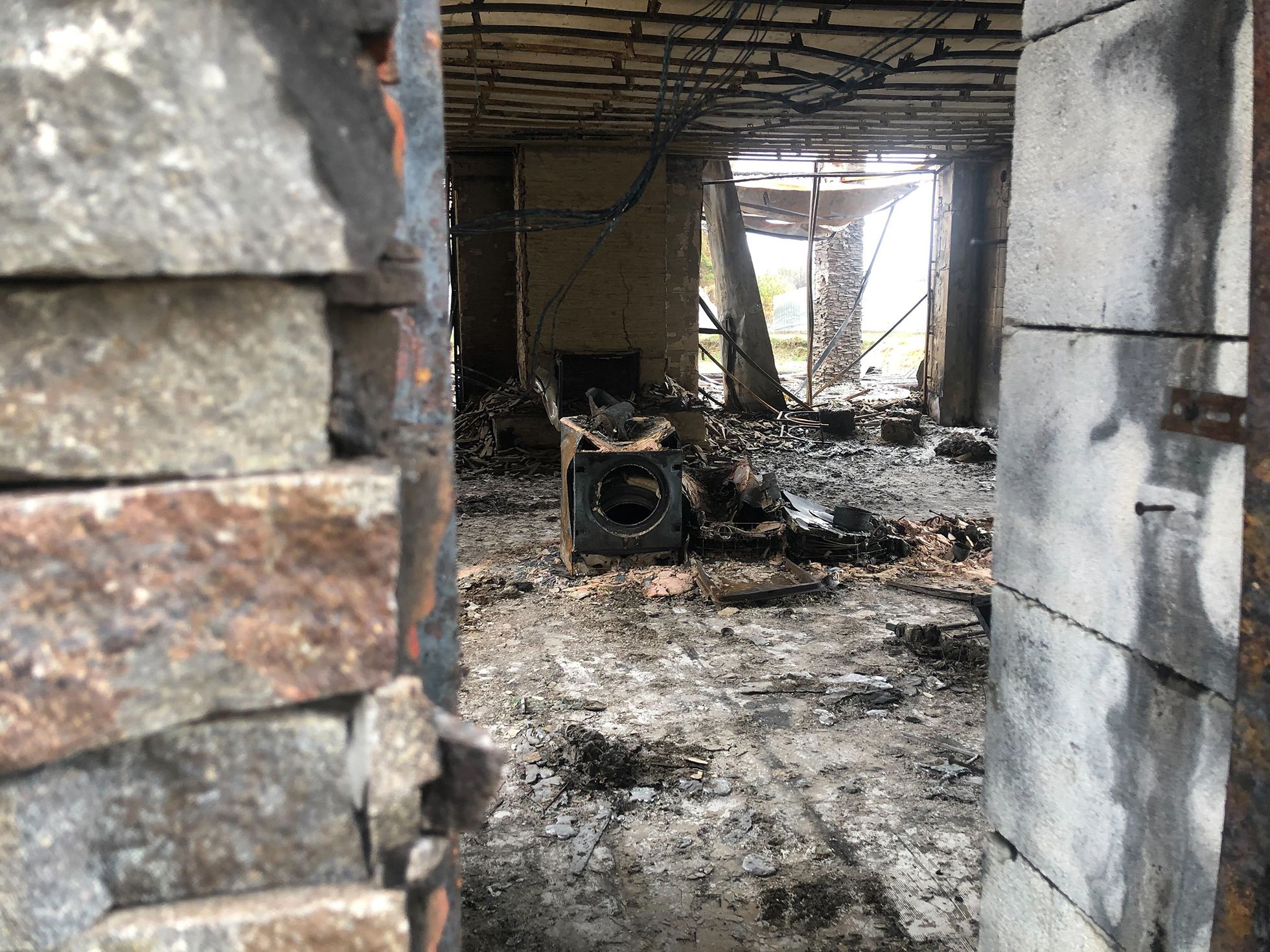 Ворота дома остались на месте — просто сдвинуты в сторону. Сквозь оконные проемы, оставшиеся без стекол, видно только почерневшую от копоти стиральную машинку. Больше внутри сгоревшего дома ничего нет — ни внутренних стен, ни мебели. В саду под побуревшими от жара елками раскиданы одеяла, нижнее белье, детская обувь и банки с соленьями, которые кто-то пытался открыть, пробивая крышку насквозь чем-то острым. Часть газона почернела: здесь разводили костер и пытались готовить.