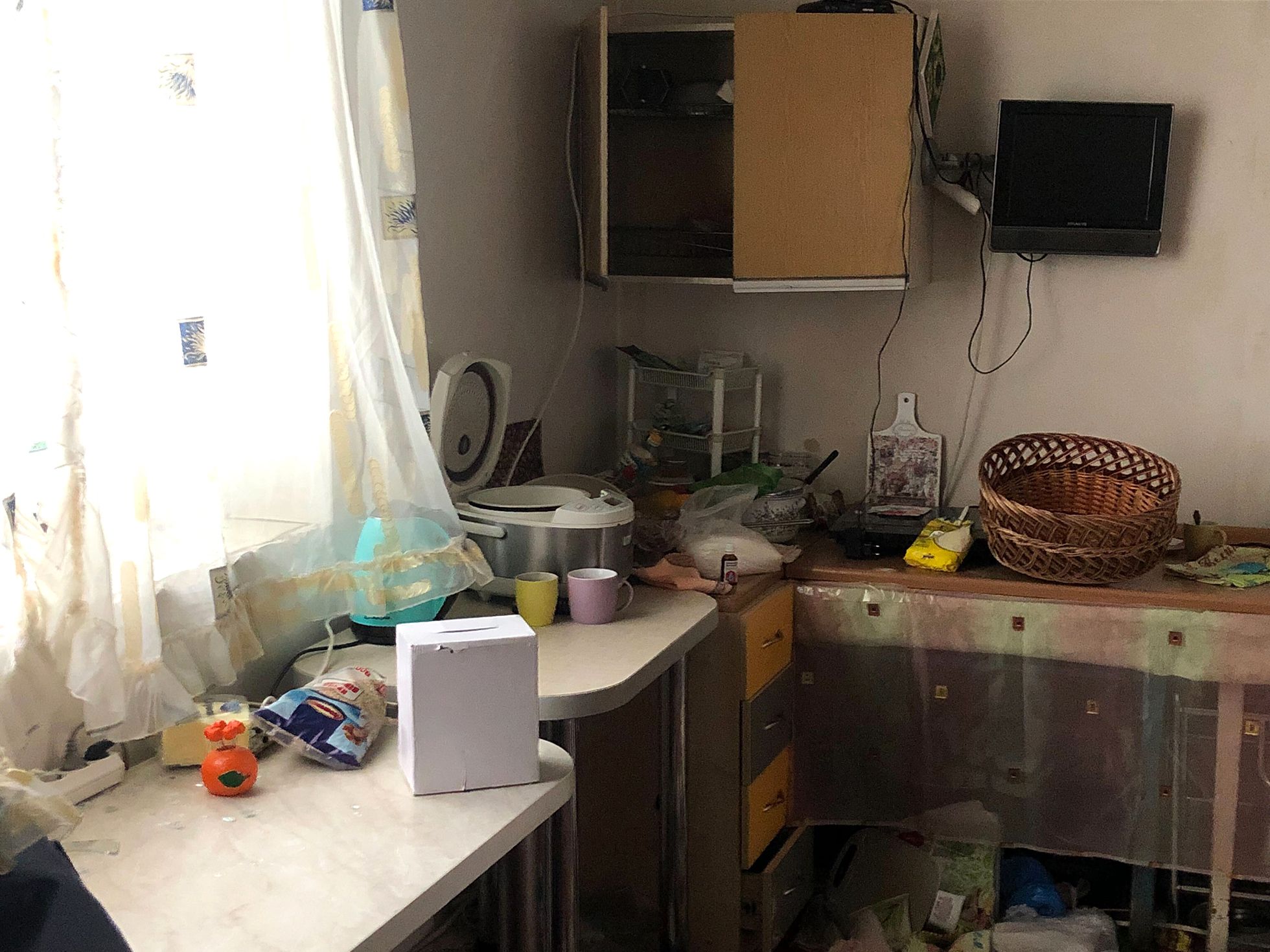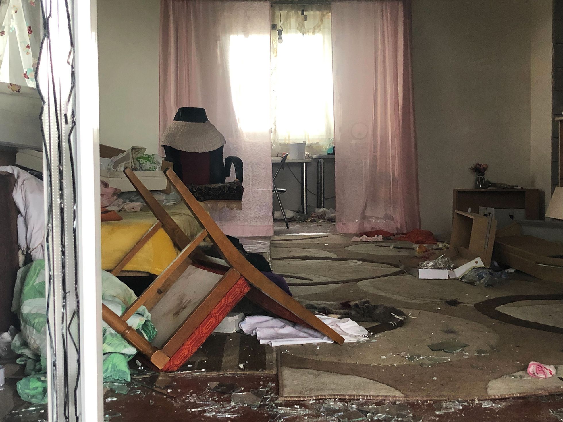 Чтобы попасть в один из домов на Залесской, теперь, после отступления из села российских военных, нужно переступить через осколки, которыми осыпалась стеклянная входная дверь на первом этаже. Внутри дома — вывернутый комод, распахнутый кухонный шкафчик, открытый холодильник, взломанный сейф. Не перевернутым остался только один стул — его поставили под лестницей на второй этаж; на сиденье лежит проржавевший гаечный ключ. На полу стоят бутылка воды и банка с консервированным горошком.