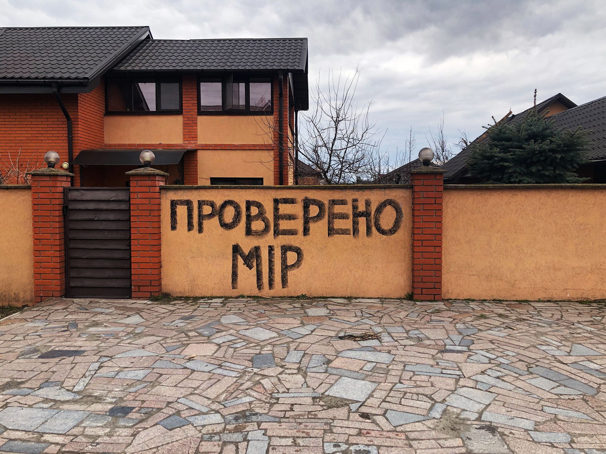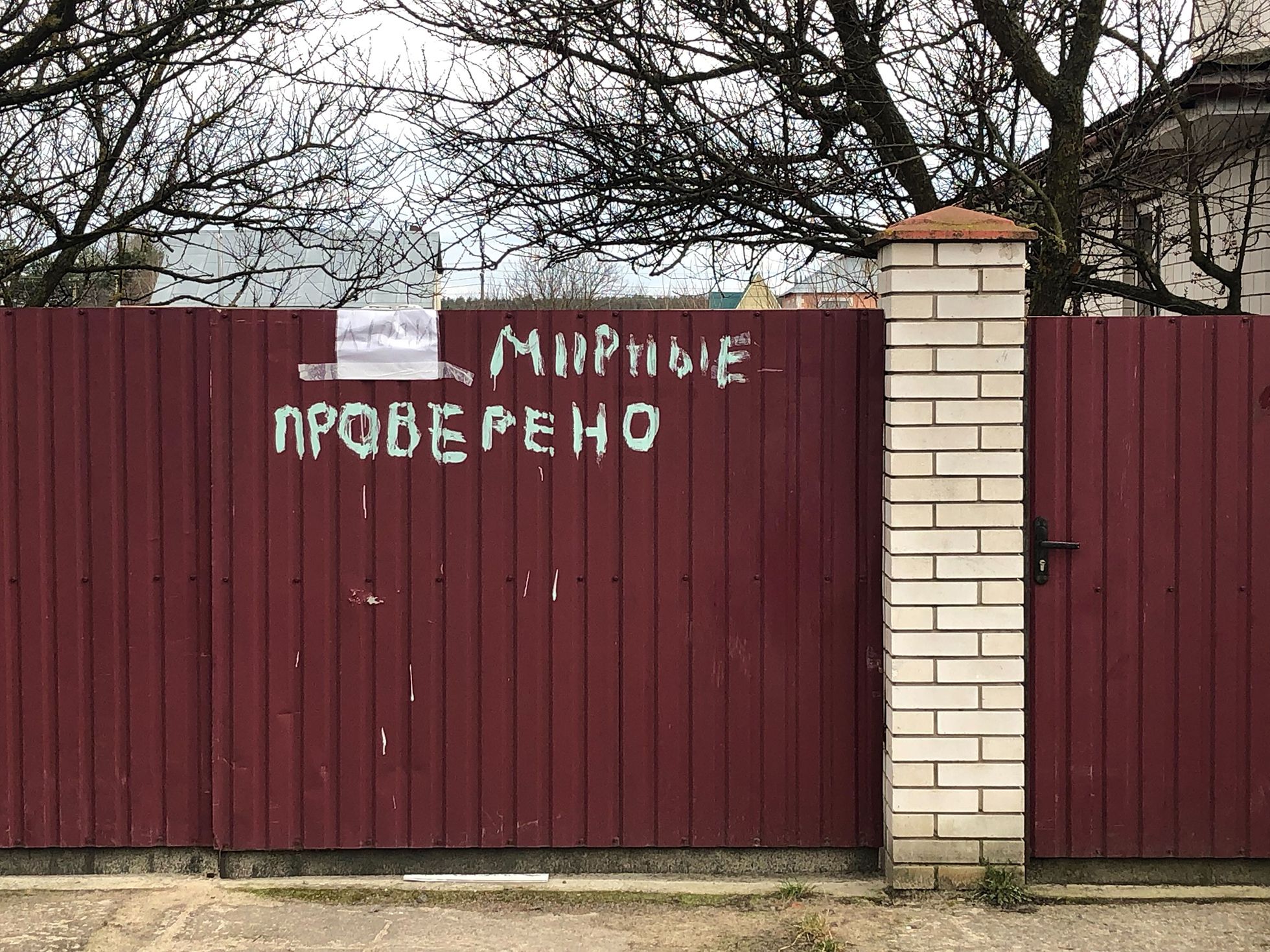 Сейчас надпись «Мирные. Проверено» можно найти на многих воротах в селе — она неброского голубого цвета, но сделана крупно, чтобы было видно издалека. После «обходов», во время которых российские военные якобы должны были искать мужчин с опытом службы в зоне АТО и оружие, солдаты оставили такие метки по всей Богдановке. Сразу после отступления российских войск из Киевской области и завершения оккупации в село вошли уже украинские саперы, и на тех же заборах появились новые обозначения: крупные точки — значит дом проверен; знаки вопроса — значит заходить опасно. Вернувшиеся домой жители находили бомбы и растяжки в своих машинах и домах. А еще — тела и свежие захоронения.