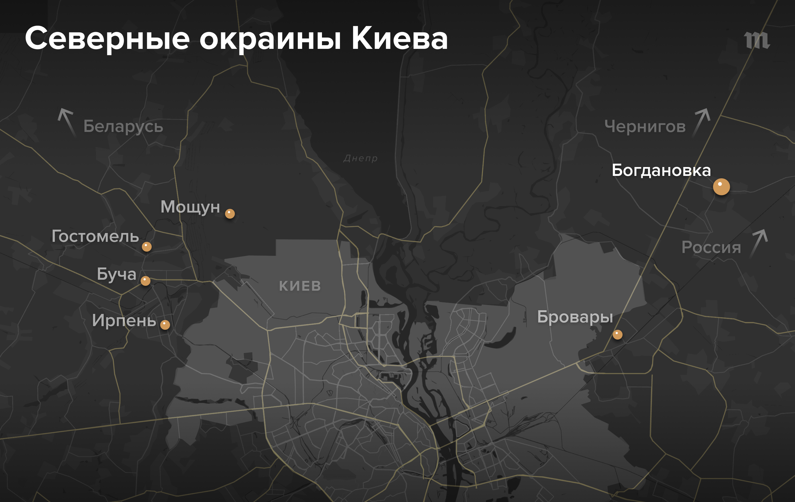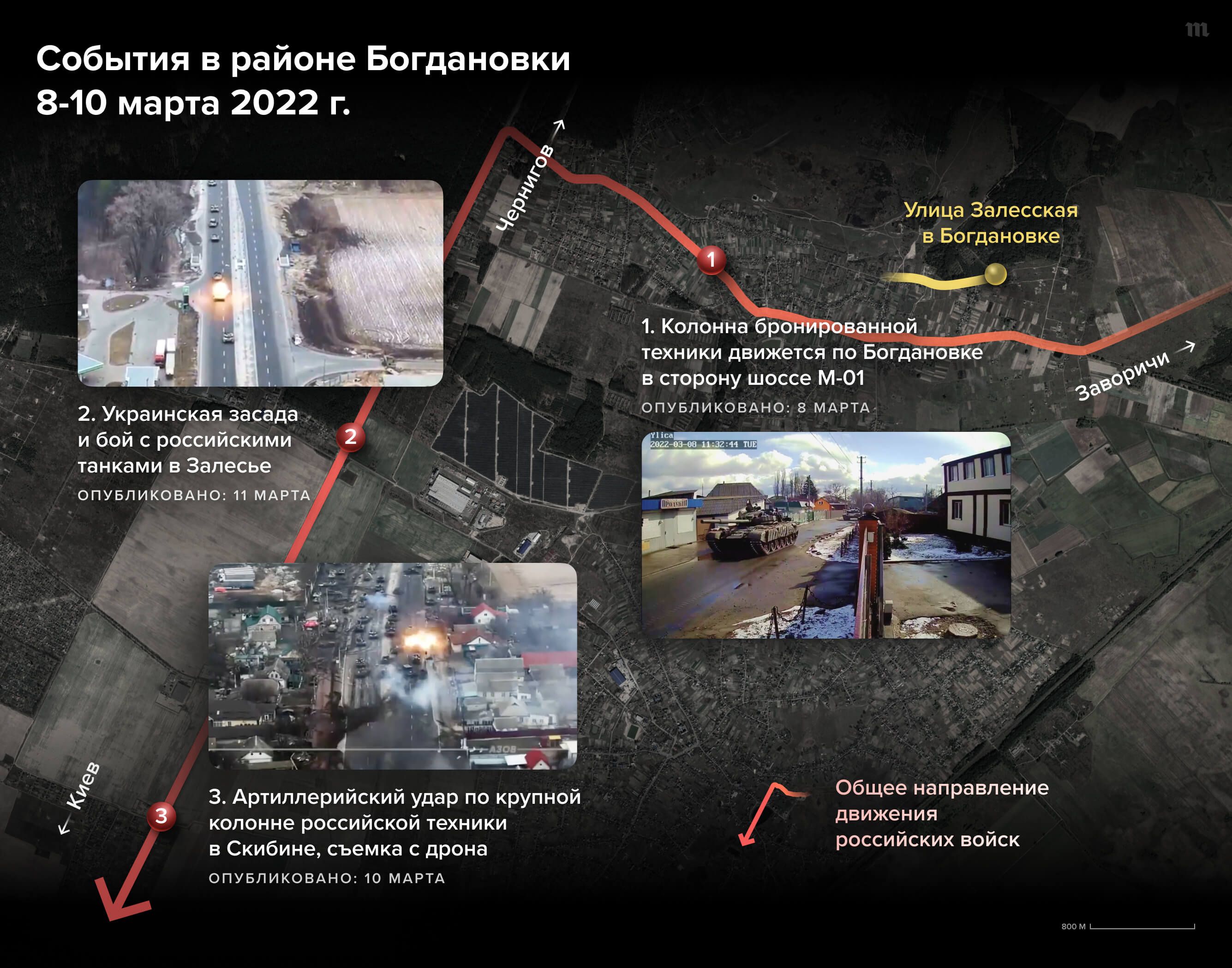 - Оккупация села Богдановка в 20 километрах от Киева началась 8 марта. Колонна военной техники (предположительно, 6-го или 239-го танкового полка из Челябинской области) прошла по главной улице и выехала на шоссе до Киева, где ее сразу атаковала украинская артиллерия.