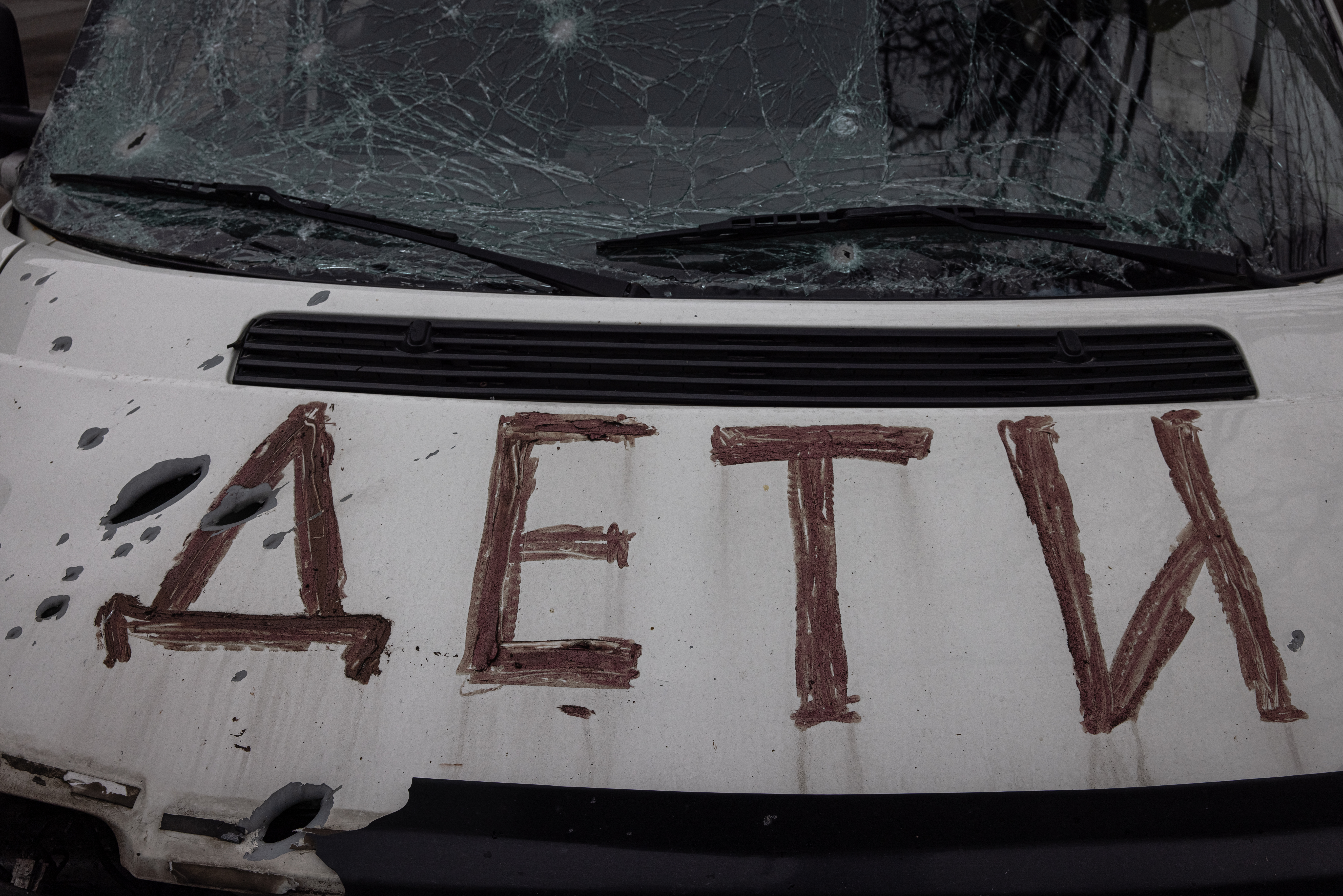 Езжу по Буче. Присматриваюсь к расстрелянным машинам. К тем, что с белыми флагами. И с надписью "Дети". Пробитые капоты. Изрешеченные пулями окна. Кровь.