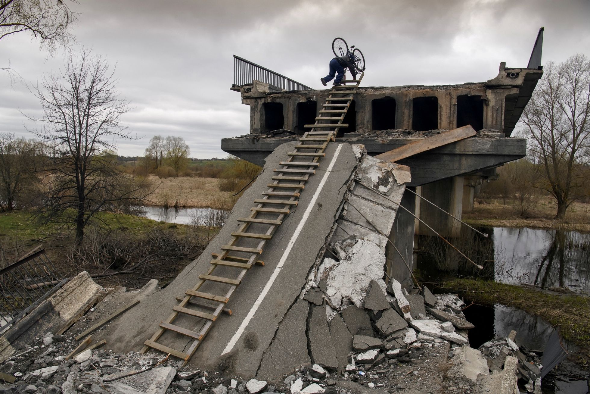 Кухари — небольшое село в Иванковском районе Киевской области — во время войны оказалось в зоне боевых действий. На фото, сделанном 19 апреля, 70-летний местный житель забирается на разрушенный мост.