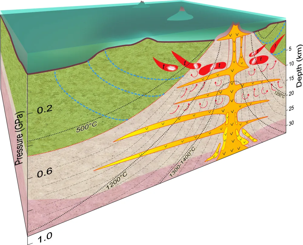 В нашей модели базальтовые магмы должны были образоваться как последние дифференцирующиеся жидкости, оставшиеся в самом конце кристаллизации магматического океана, а затем локально внедриться и смешаться с самой верхней серпентинизированной корой. Взаимодействие между магмой и материалом протокоры должно было вызвать дегидратацию серпентинизированного перидотита. Впоследствии перидотит должен был частично расплавиться, чтобы образовать кислые расплавы на небольшой глубине, как мы наблюдали в наших экспериментах. Затем эти расплавы должны были остыть, образовав первую кислую кору (рис. 1). Частые удары метеоритов в гадее могли способствовать этому смешиванию и взаимодействию за счет трещин, нагрева и содействия конвекции воды через частичное плавление протокоры.