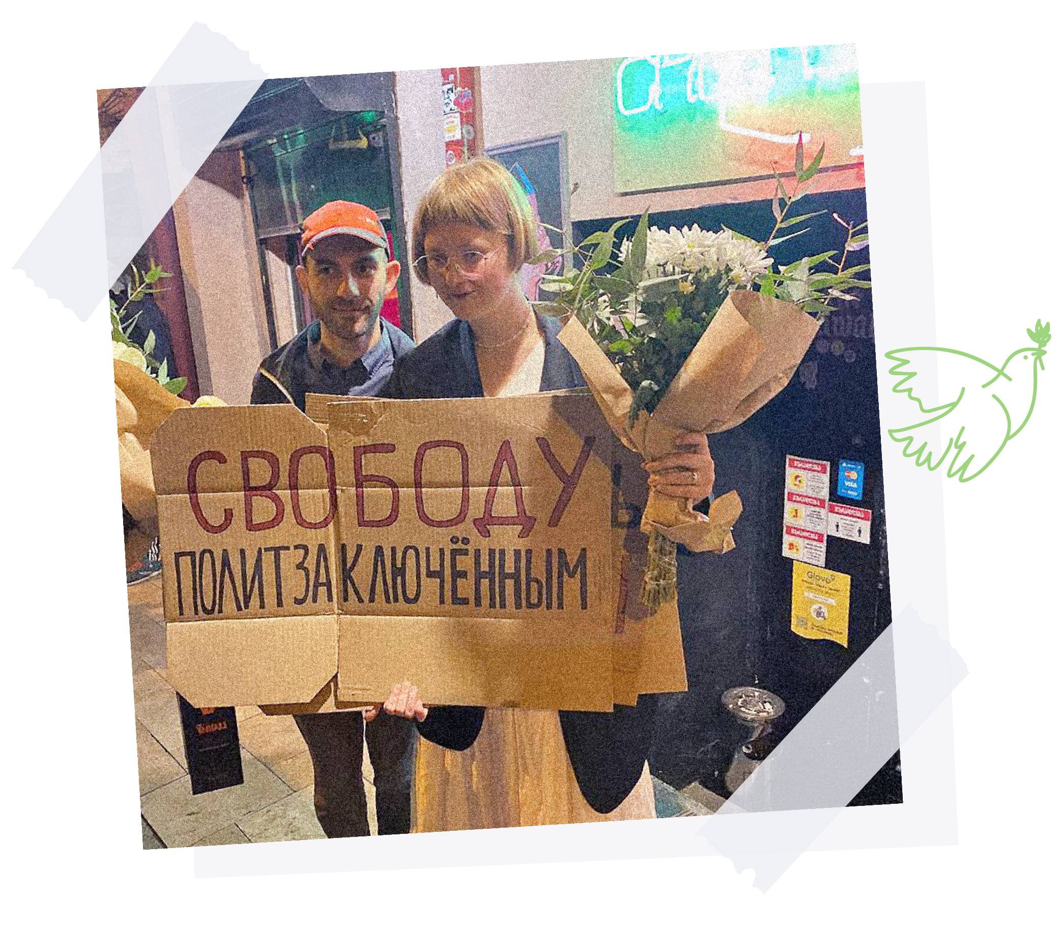 Соня — студентка и обвиняемая по уголовному делу о сожжении чучела. Арсен — независимый журналист. Они познакомились в феврале. В марте Арсен уехал из России, а Соню посадили в ИВС. В апреле они поженились в Грузии.