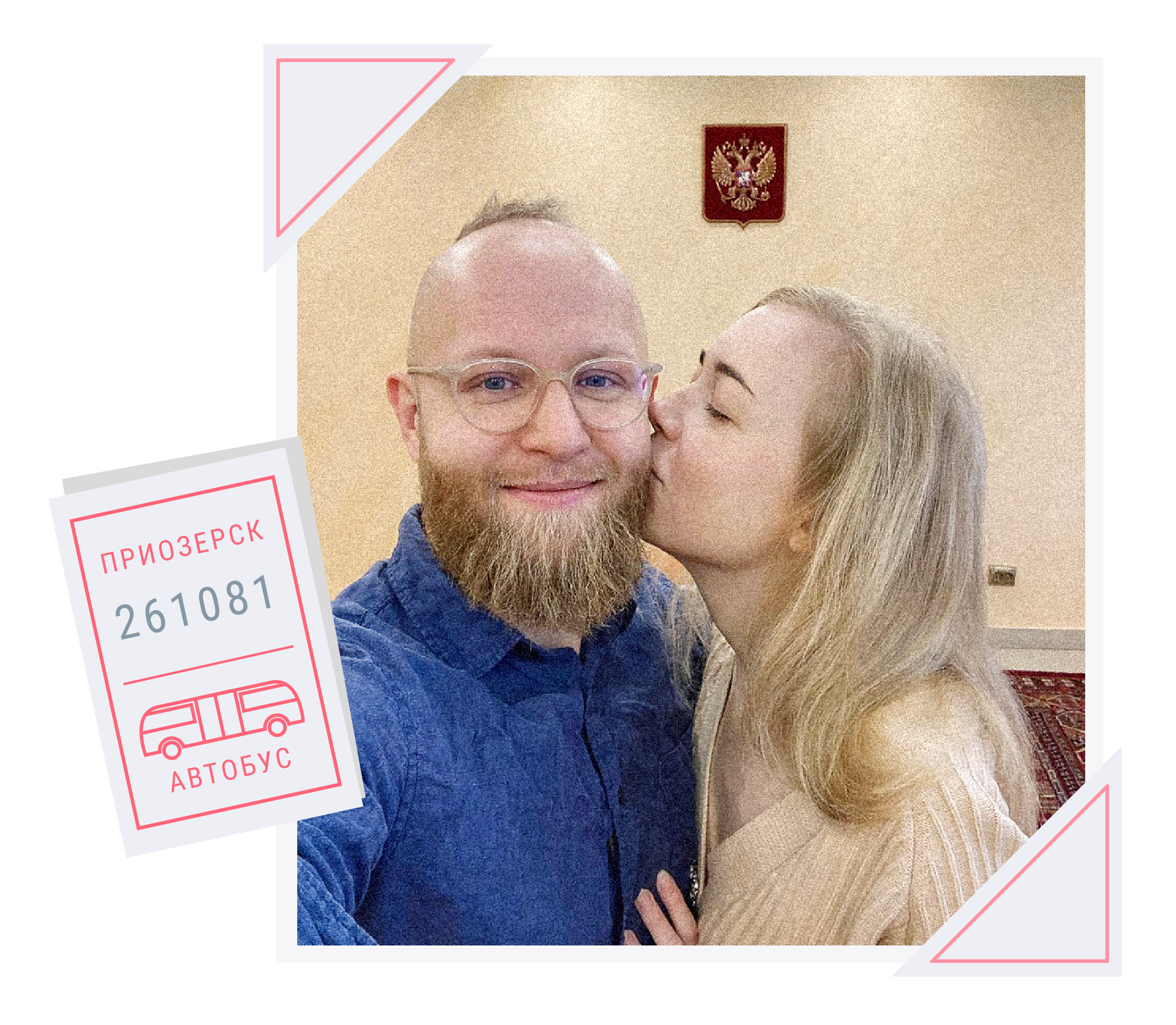 С: Как мы поехали заключать брак в Приозерск — это, конечно, «романтическая история». У нас было назначено на 10 утра. В итоге в 7 утра нам нужно было уже находиться в Девяткино, чтобы сесть в автобус. В общем, этот день точно запомнился надолго.
