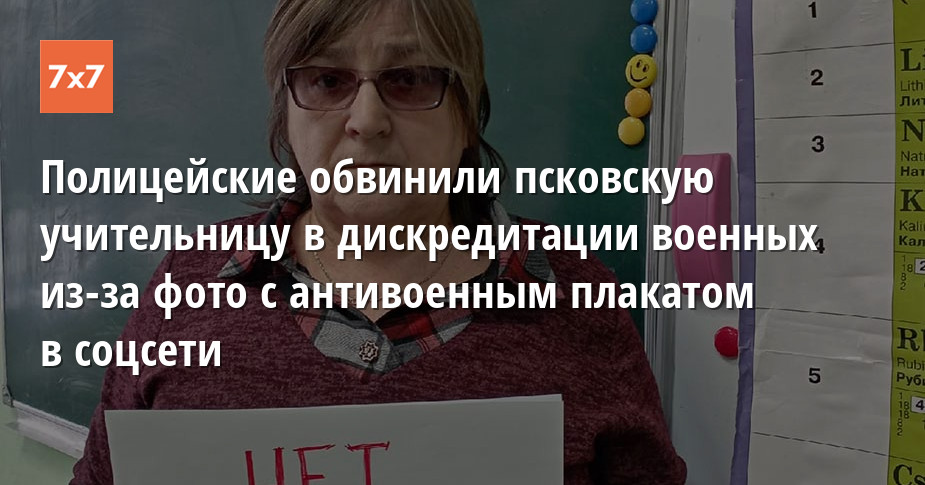 Псковские полицейские обвинили в дискредитации Российской армии учительницу математики Любовь Жильцову. 25 февраля она опубликовала в соцсети «ВКонтакте» фото с антивоенным лозунгом на фоне доски с магнитами в цвет украинского флага. Об этом «7х7» рассказала Жильцова.
