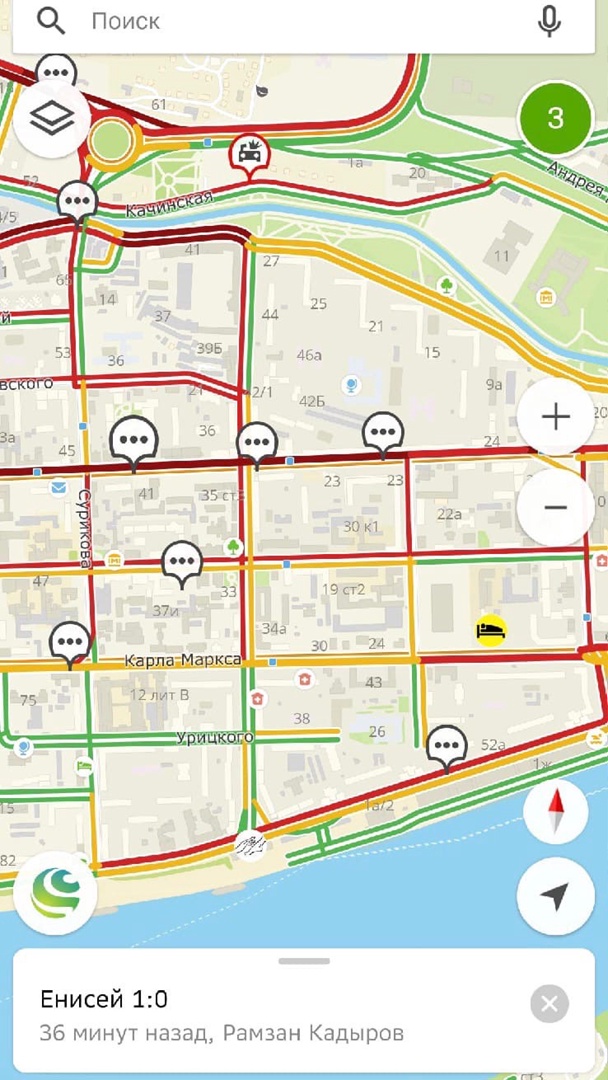 На фоне этого события Красноярск встал в пробки. Бордовым и красным отмечены центральные улицы: Карла Маркса, Вейнбаума, Дубровинского, Сурикова и другие.