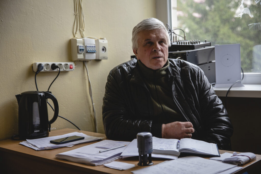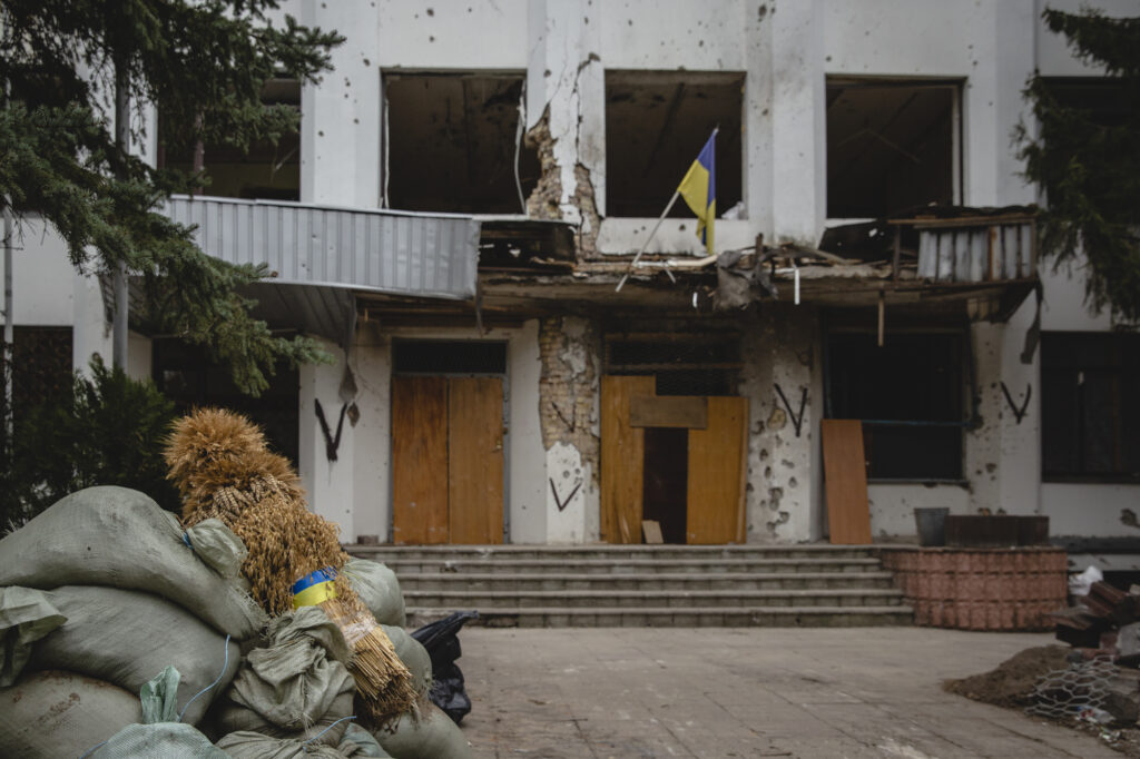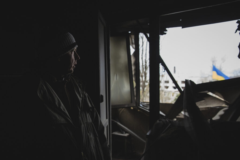 Он подходит к проему в стене, где когда-то были окна, и показывает: «Солнце вставало и вот так проходило по кругу». В проем видно центральную площадь, где развевается новый сине-желтый флаг — старый сорвали российские военные. Напротив многоэтажки, через площадь, — дом культуры с выбитыми стеклами. На площади — памятник Тарасу Шевченко с простреленной головой.