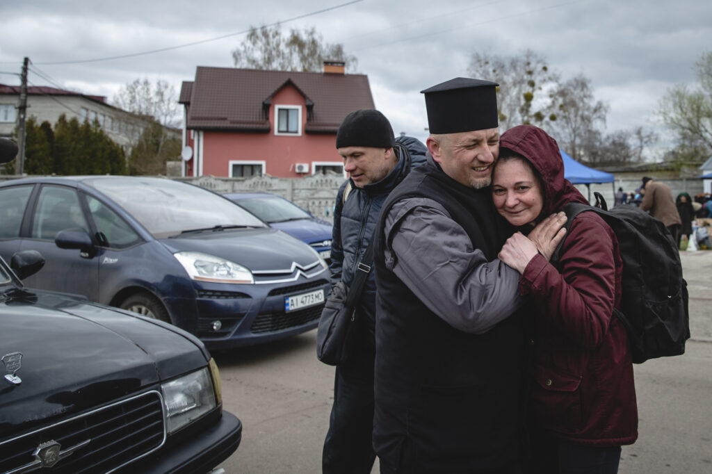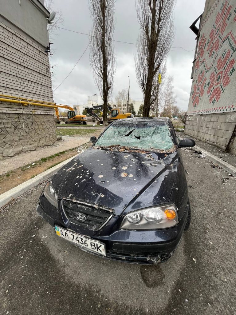 У подъезда в тот момент уже был припаркован его синий «фольксваген» с вещами и тремя котами: на нем он собирался выезжать из Бородянки. Дочь к тому моменту уже была в безопасном месте. Осколки попали в машину, но не повредили бензобак и колеса. Зато две соседские машины оказались разбиты в хлам, поэтому пять человек из квартиры напротив, которые тоже собирались эвакуироваться, пришлось брать к себе. В машину поместились еще двое товарищей Дмитрия из другого подъезда и семья пенсионеров с дочкой с восьмого этажа: «Всей кучей там и сидели, кто на полу, кто на вещах, кто на котах. Вот так ехали — дверей нету, задние висят. Это уже потом я их притулил».