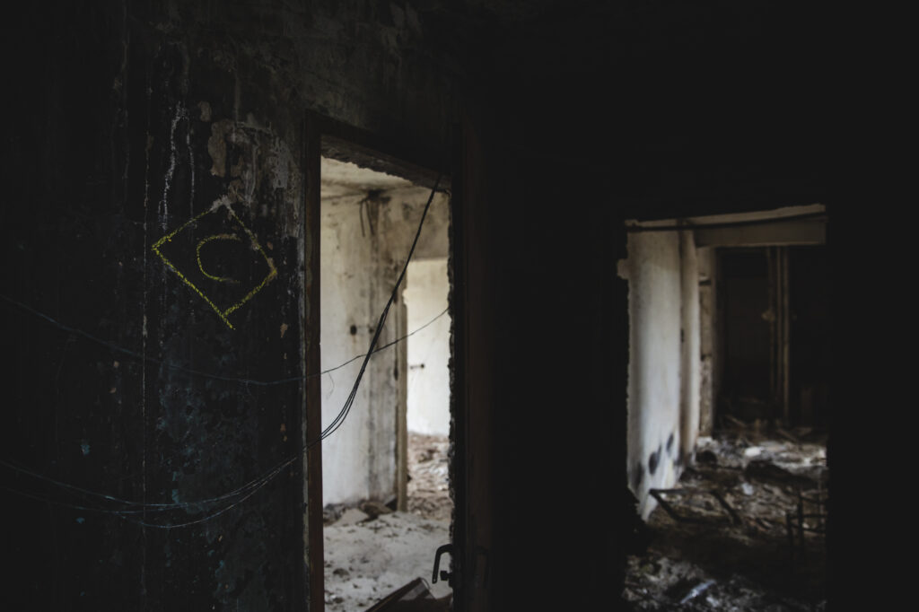В подъезде дома на улице Центральной пахнет гарью. Лестницы усыпаны битым стеклом и бетонным крошевом, потолки и стены покрыты плотным слоем копоти. Из дома словно вынули сердцевину — на каждом этаже с правой стороны зияют страшные проемы, сквозь которые видно обгоревшие коробки квартир в последнем подъезде.