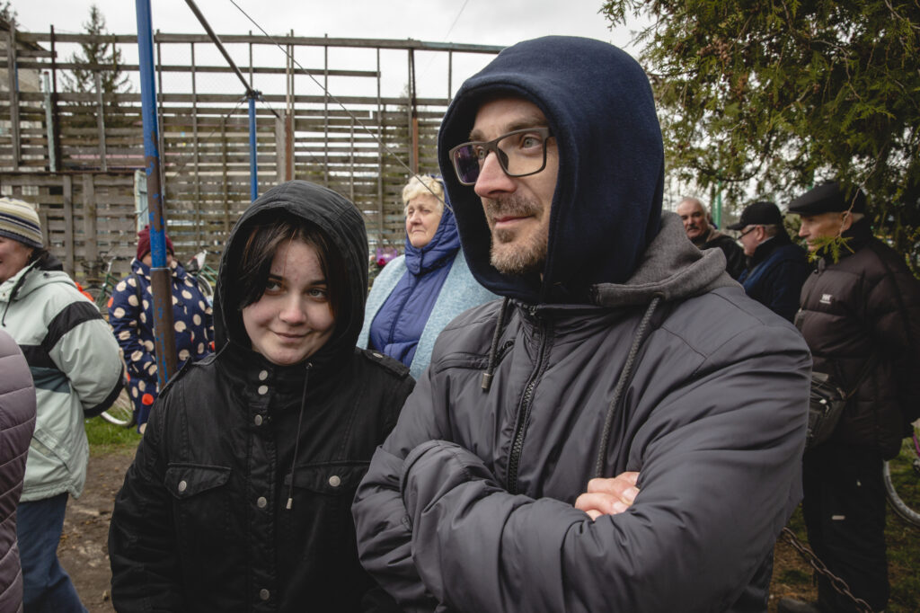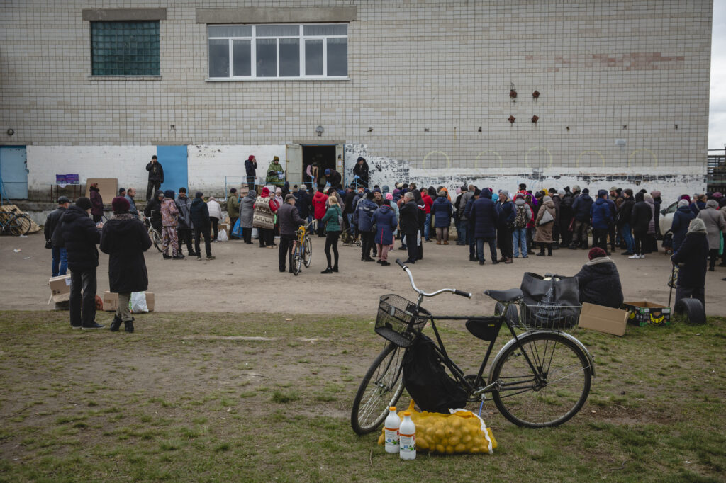 «Мой крестный умер, а каким образом, мы не знаем. Похоронили сначала прямо под домом, а потом перехоронили», — рассказывает 16-летняя Лиза. Вместе со своим старшим братом Сергеем она стоит в очереди в школу, где раздают гуманитарную помощь. Это та самая школа, где она училась в мирное время. Теперь здесь каждый день собирается очередь из нескольких сотен людей: магазины не работают, еды достать больше негде.