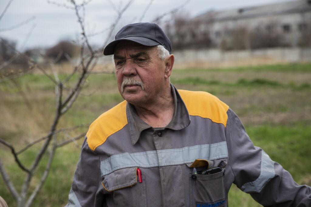 Дмитрий Садофьев, сухощавый мужчина в сером плаще, сосредоточенно работает на клумбе у дома. Его семья жила здесь много десятилетий — он помнит, как одно из абрикосовых деревьев посадила его бабушка, когда он сам был еще подростком. Теперь он собирает в кучу во дворе обломки, осыпавшиеся на землю после авиаудара. На лице у Садофьева одновременно злость и растерянность. «Ну а кто же будет убирать? Вон, видите, цветы», — показывает он на нарциссы, распустившиеся посреди обломков на клумбе. Потом поднимает лежащий в траве кусок порыжевшего металла: «Осколок».
