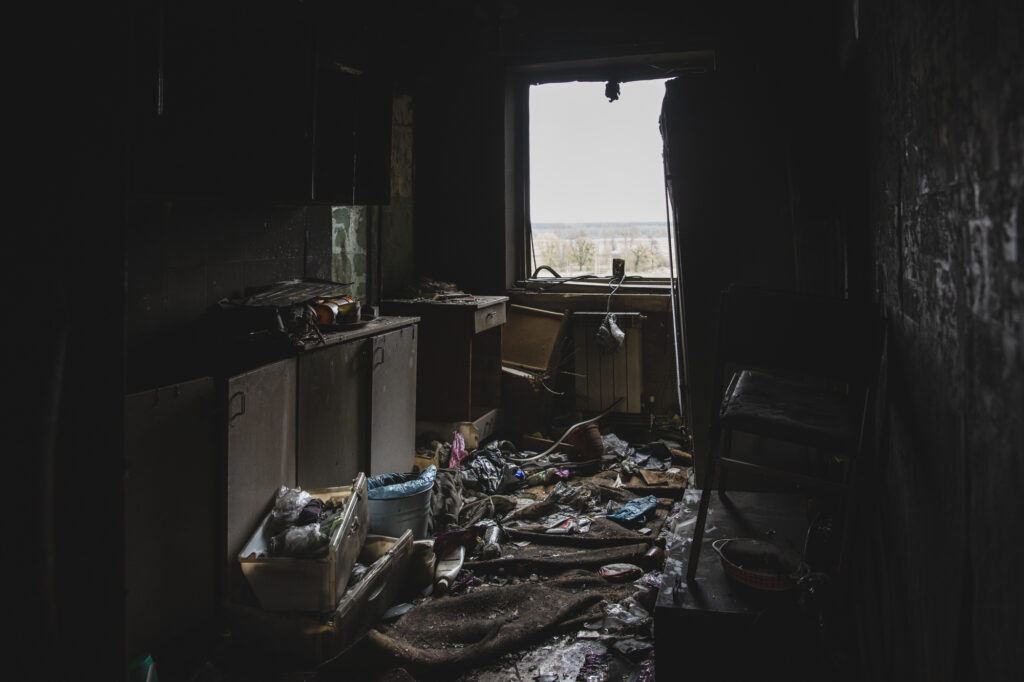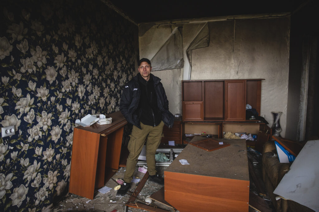 27-летний Николай Пономаренко тоже жил в этом доме. Вместе с женой Юлией они купили квартиру год назад и только закончили ремонт. Юлия — его одноклассница, они женаты с 18 лет, но это было их первое собственное жилье: дизайн жена выбирала сама. Сейчас Юлия с кошкой Маркизой далеко от Киева, и что стало с квартирой, видела только на фотографиях. «Я бы ее сюда и не пустил просто», — говорит Николай. О жене он рассказывает с нежностью. В их спальне повсюду мягкие игрушки — теперь они в черной копоти. В 2022 году пара планировала завести ребенка.