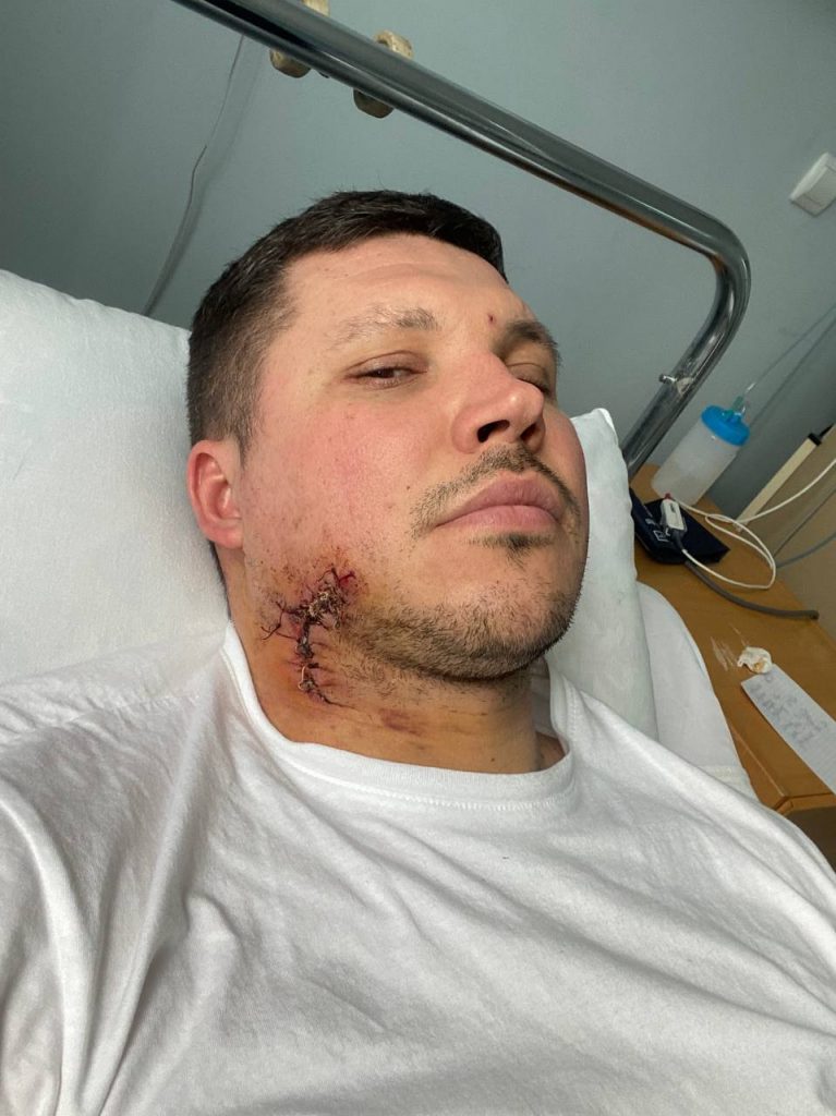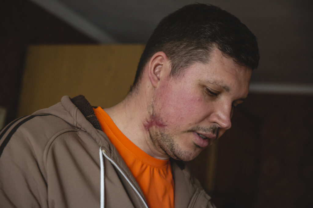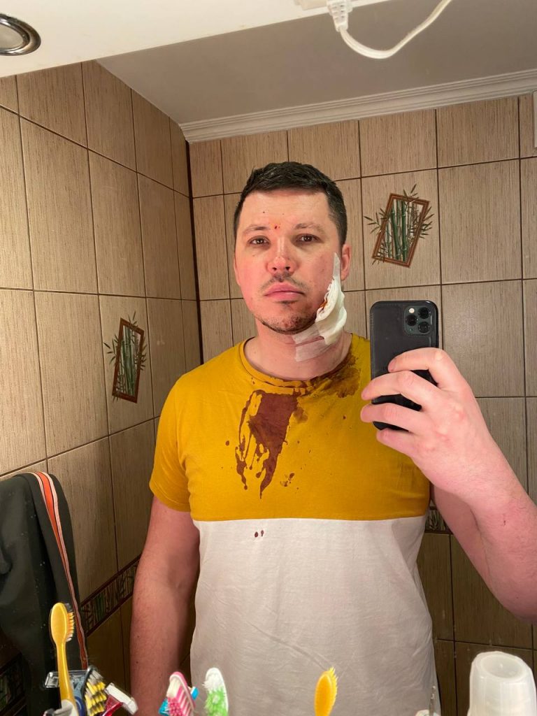 По словам Ковалева, пуля пробило окно, и осколки разлетелись по комнате. В этот момент ему повезло во второй раз — осколок попал ему в шею, но не задел сонную артерию. «Помню, встал над ванной, кровь херачит, но я себя нормально чувствую. У меня шок, наверное, был, мне вообще не больно было. Потом брат взял бинт, обмотал. Хорошо, что больница у нас здесь, а не через дорогу, потому что [по дороге] колонны идут, — вспоминает он. — Мы побежали в больницу, меня как попало зашили. Части кожи не было, она оторвалась. Сейчас я поворачиваю голову, у меня пол-лица натягивается».