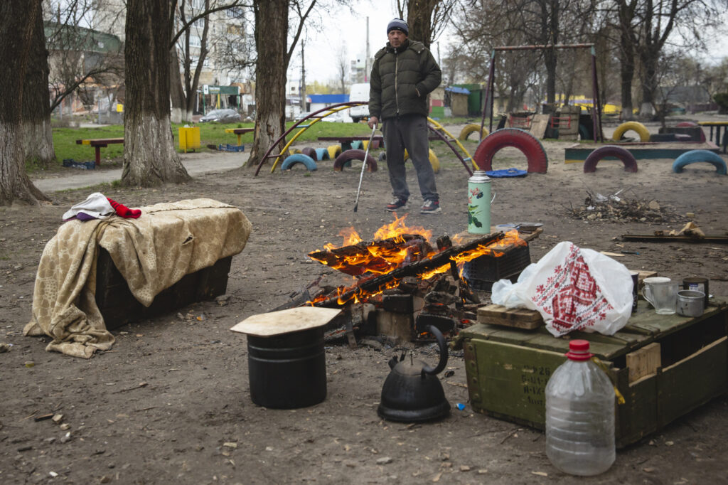 В центре Бородянки стоит компания: Сергей Ярмощенко, его жена Наталья и их друг Владимир жгут костер из армейских деревянных ящиков, оставшихся от военных. На костре варят суп в эмалированном ведре. На вопрос, из чего он, Сергей отвечает — из всего, что нашли.