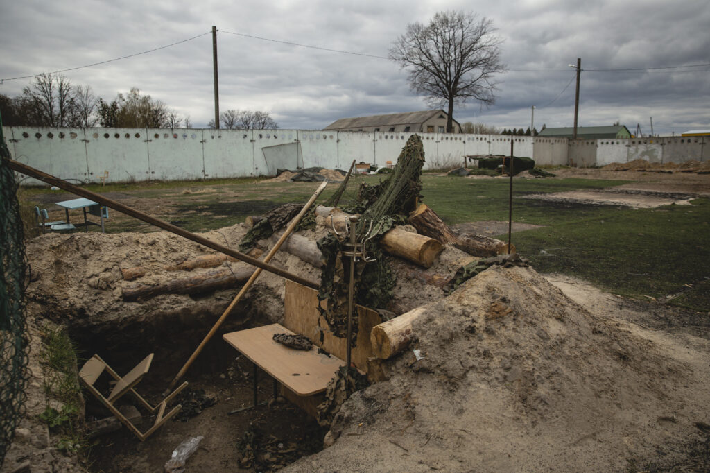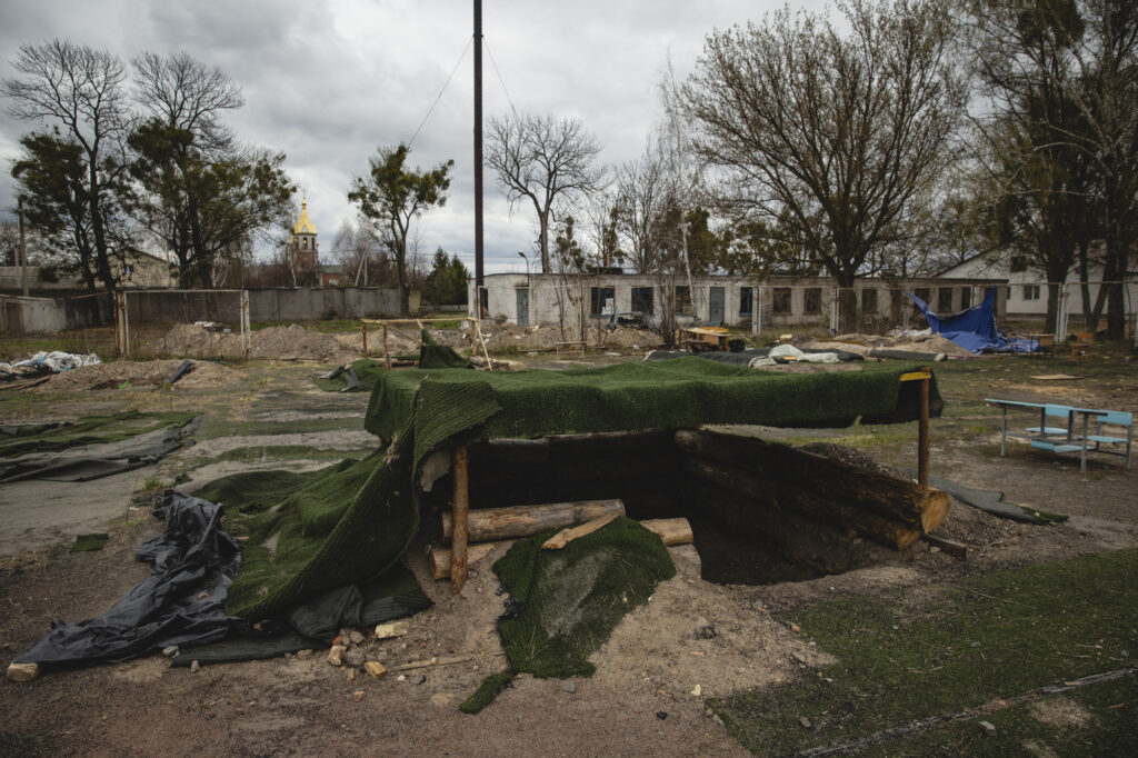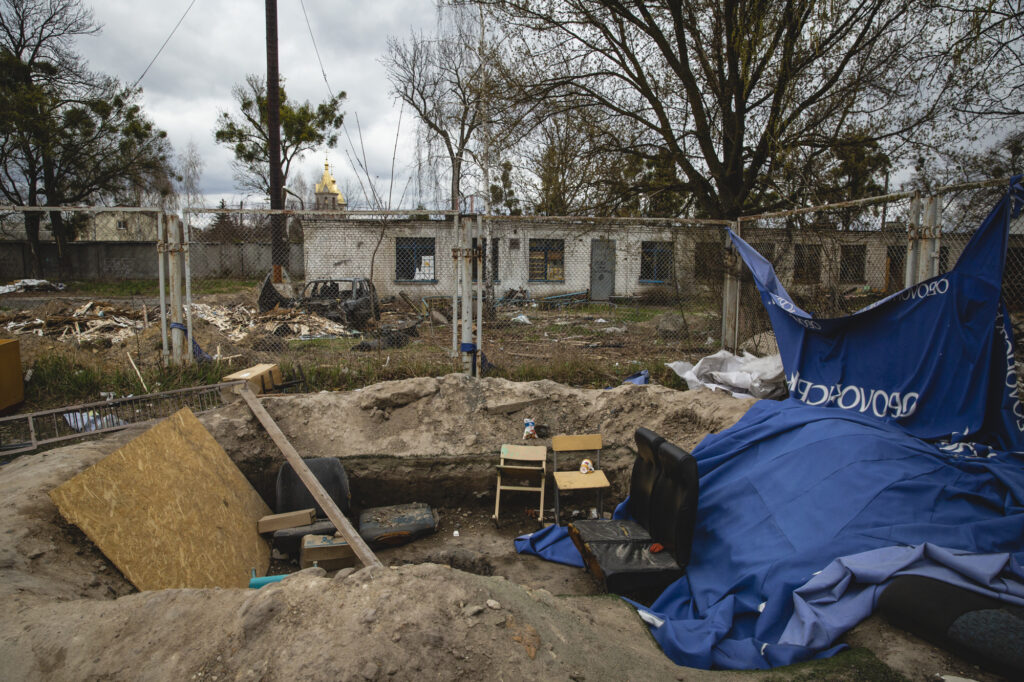 В другой школе Бородянки располагались российские военные. Теперь ее территория перекопана: повсюду траншеи и землянки. Есть даже окоп для отдыха — там стоят школьные стулья и вырванные из машины кресла. Под ногами всюду валяются упаковки от армейских пайков.
