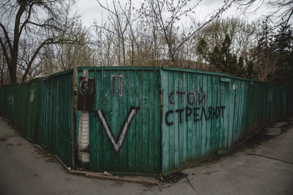 Какое-то время они с женой провели в соседнем селе Дружня, рассказывает Сергей: «Выхожу на улицу покурить, а там они дома шмонают, машут: иди сюда. Открывали дверь и вперед меня пропускали. Чтобы, если будут стрелять, попали не по ним, а по мне. Я походил, провел их в пару домов, а что делать. А Наташка давай у них автоматы из рук вырывать: “Какого хера вы сюда пришли?”. Но они спокойные были, такие, человечные нам попались». Сергей говорит, что военные «учили его жизни»: «Типа это не они Бородянку расстреляли, а это наше СБУ. А они нас пытаются спасти. Рассказывают вот такую хрень».