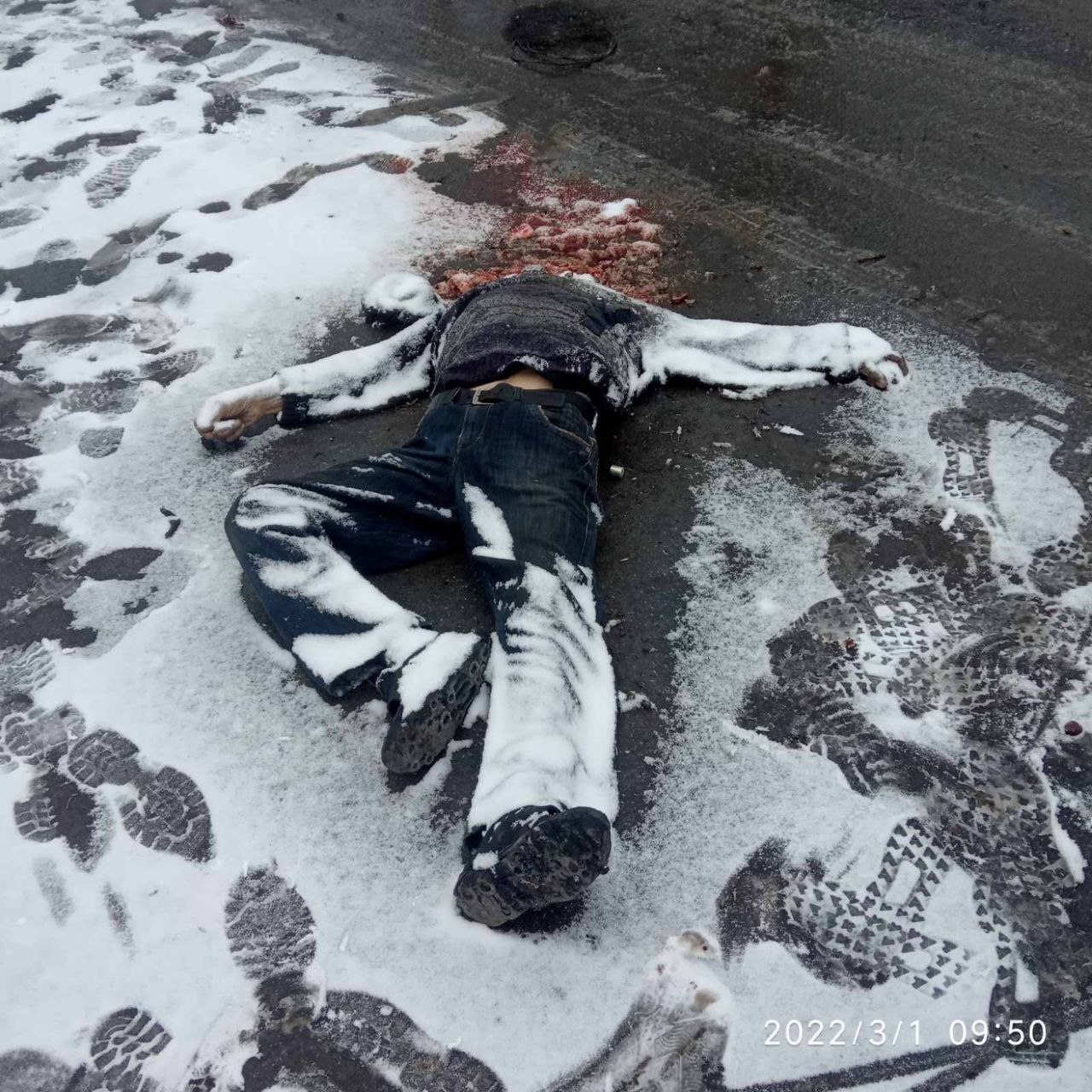 Александр показывает фото с телефона, сделанные утром 1 марта, когда они с братом нашли тело отца на дороге. На одном из снимков — тело Сергея с раскинутыми в сторону руками. Его уже присыпало снегом. На месте головы — кровавое месиво.