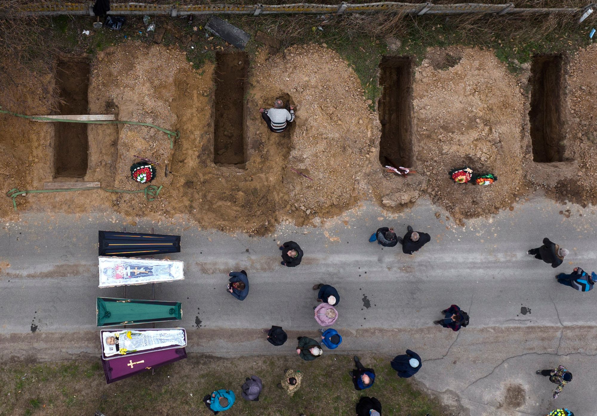 В другом населенном пункте Киевской области, Буче, продолжается эксгумация тел из братских могил, опознание и похороны погибших во время российской оккупации. Фото сделано на кладбище Бучи 20 апреля.