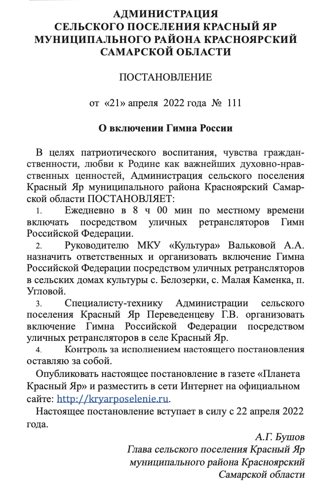 Постановление №111 подписано главой сельского поселения Алексеем Бушовым. Документ поручает руководителю МКУ "Культура" Альбине Вальковой организовать трансляцию в сёлах Белозёрки, Малая Каменка и посёлке Угловом. А специалист-техник Глеб Переведенцев организует звучание государственного гимна Красном Яру.