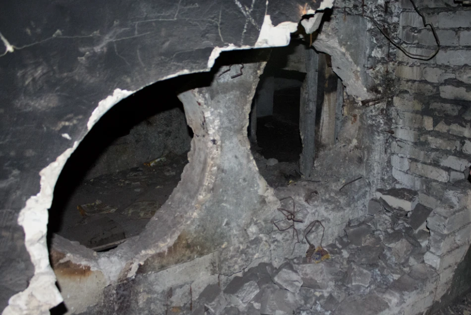 В стенах — круглые и квадратные отверстия, оставшиеся от коробов вентиляции и автономного водоснабжения. Весь металл, даже вмонтированные в бетон детали гермошлюза, выдран с корнем. При строительстве жилого микрорайона убежище пытались переделать в подземный паркинг. Полутораметровой толщины стены, рассчитанные на прямое попадание бомбы, не поддались.