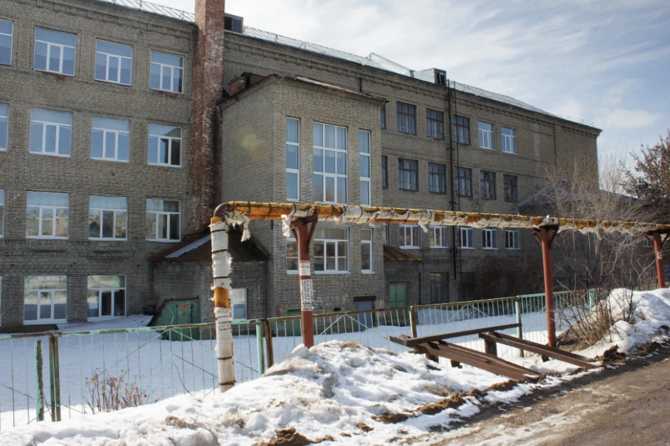 Школьное здание было построено в 1930-х годах и выглядит на все свои почти сто. Кирпичи на фасаде крошатся. Зеленый забор из металлических прутьев погнут.