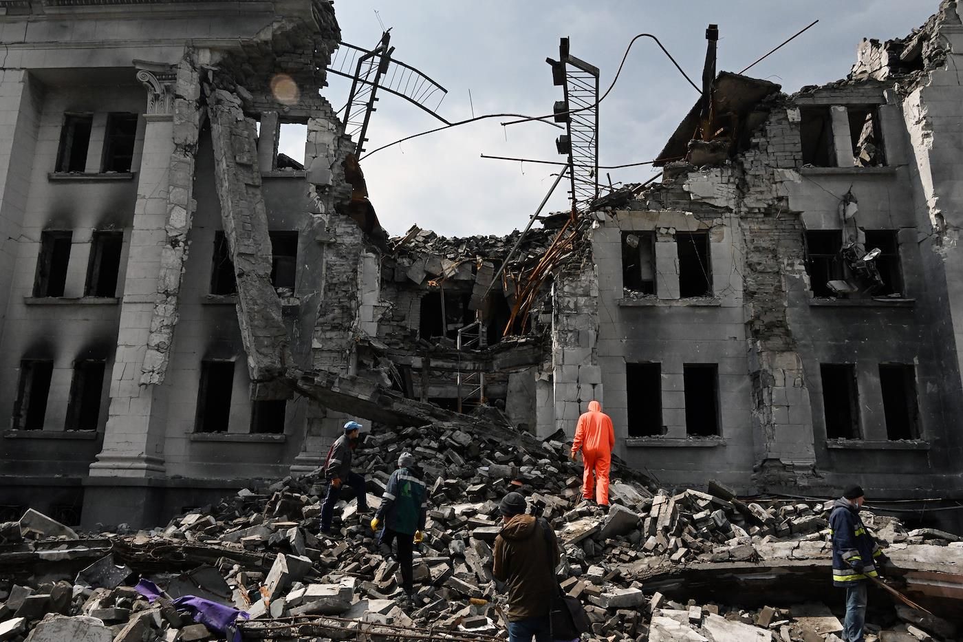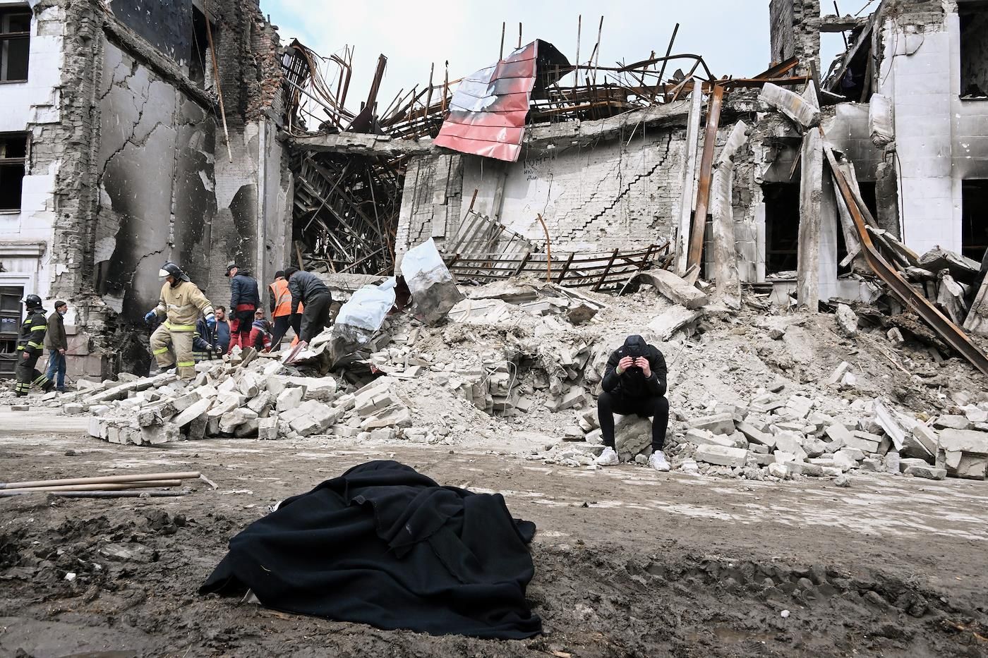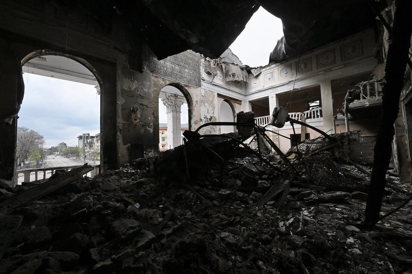 Сейчас в разрушенном театре идет разбор завалов, под которыми находят погибших. Эти фотографии с места проведения поисковой операции были обнародованы 22 апреля.
