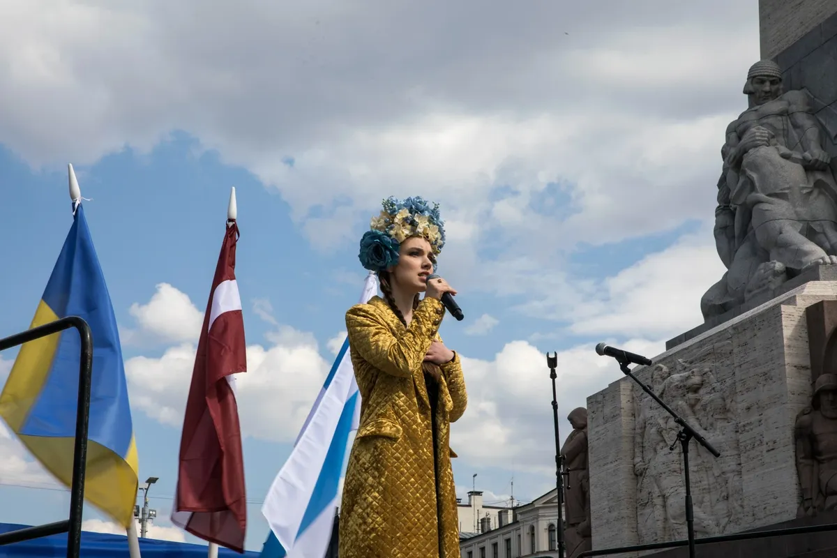 Рядом с памятником Свободы установлена небольшая сцена. Акция начинается с выступления латвийско-украинской музыкантки Катрины Гупало. Девушка, пришедшая на митинг в золотом плаще и голубом венке, исполняет латвийский и украинский гимны. Она же выдерживает минуту молчания, чтобы почтить память погибших во время боевых действий.