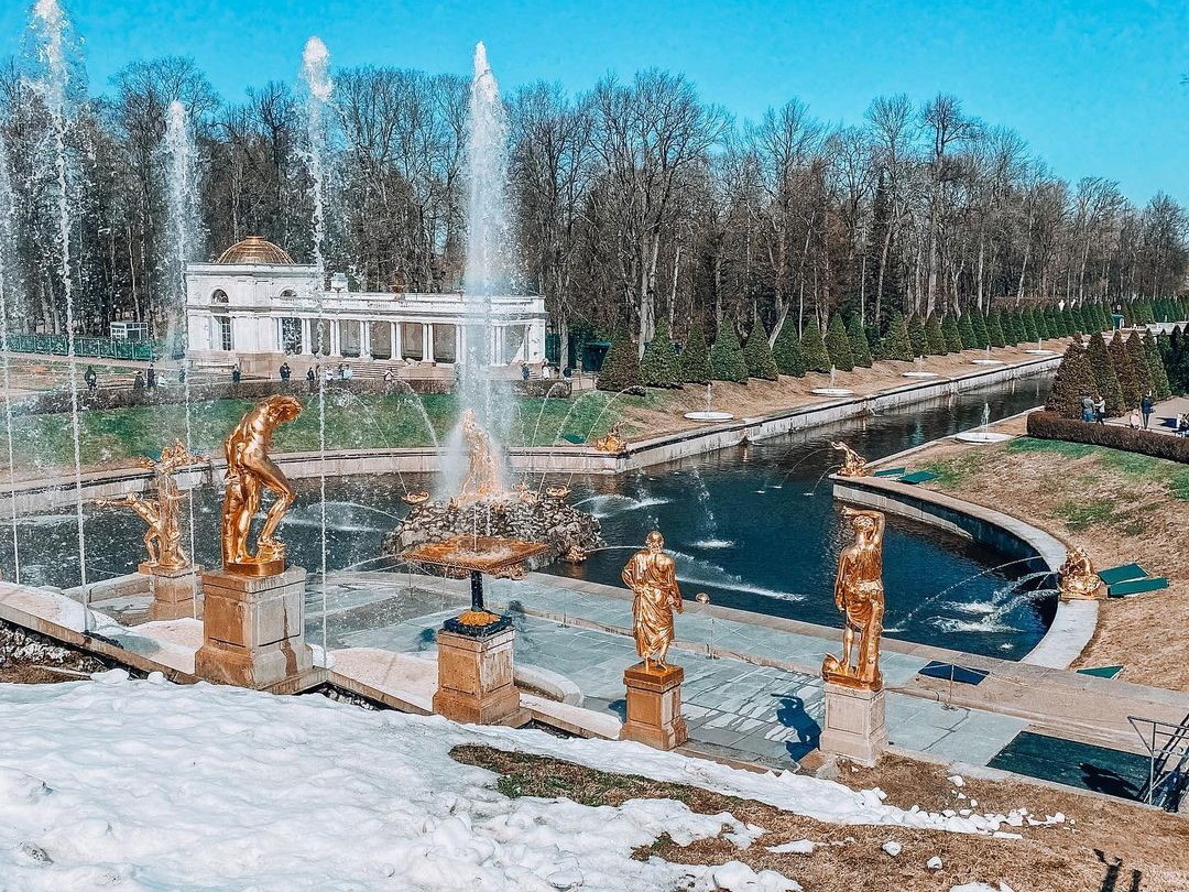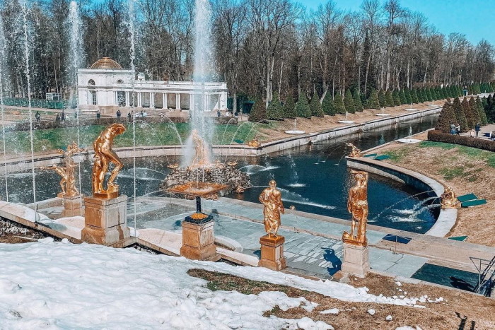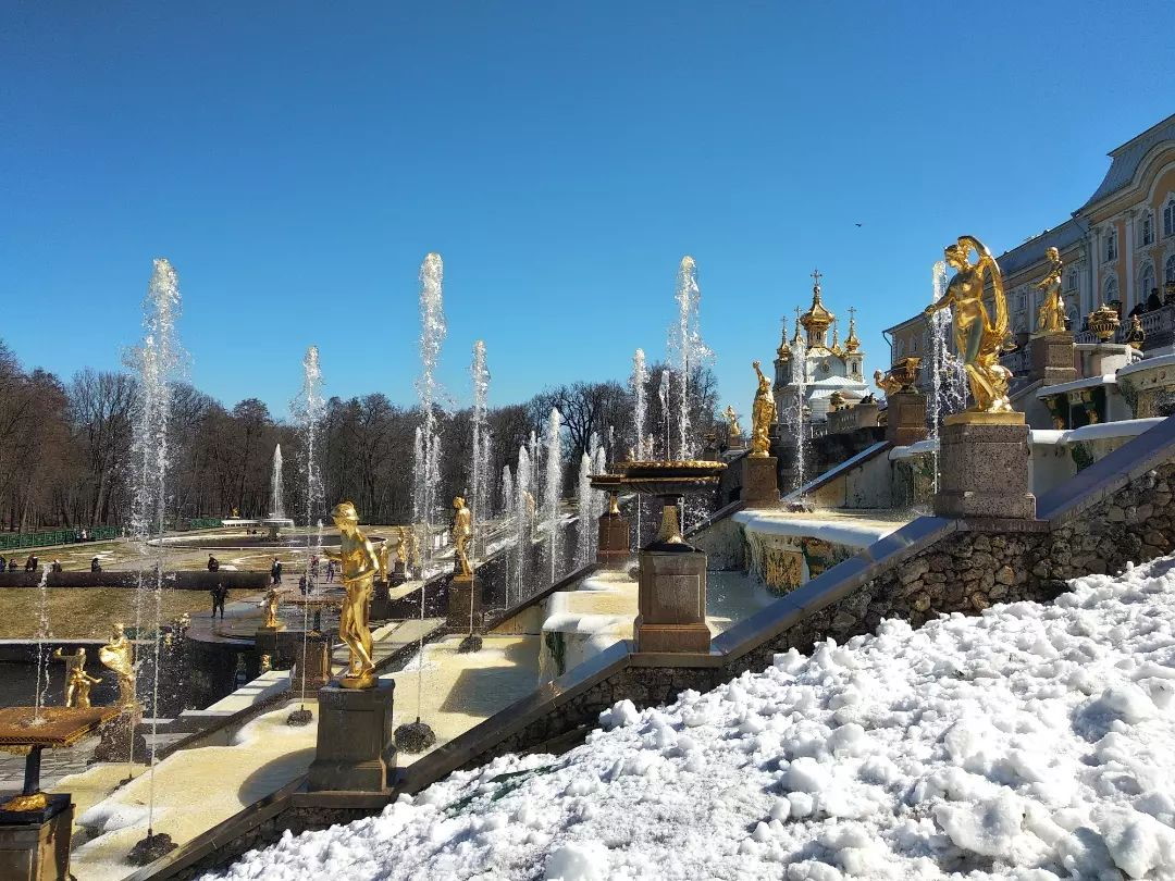В Петергофе еще не растаял весь снег, но сезон фонтанов открыли