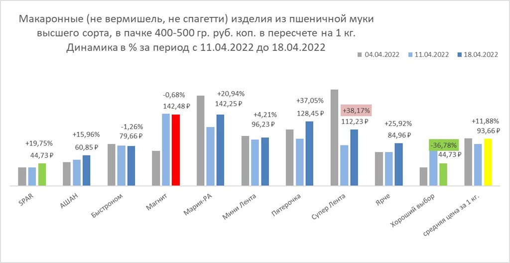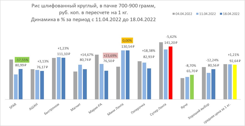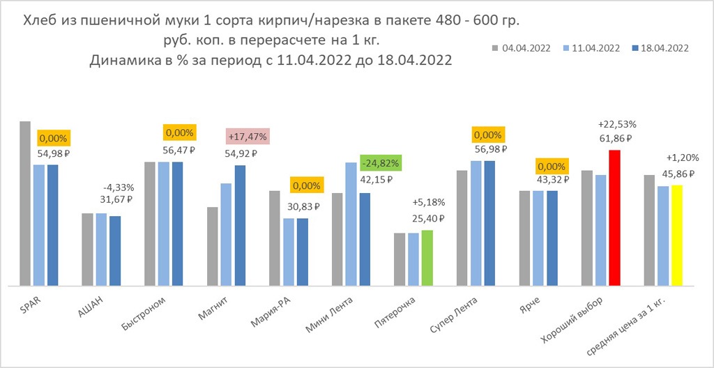 Цены фиксируют в магазинах Spar, «Ашан», «Быстроном», «Магнит», «Мария-Ра», «Мини Лента», «Пятерочка», «Супер Лента», «Ярче» и «Хороший выбор». Принцип выбора товара — самая низкая стоимость в момент проверки.
