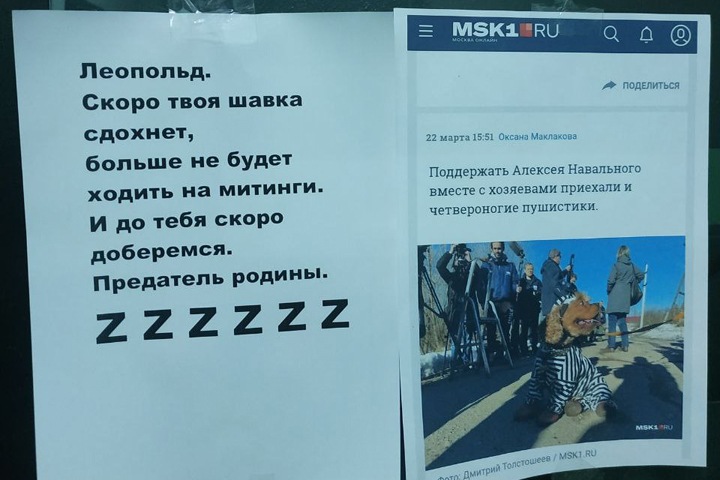 13:50 На двери квартиры московского активиста Леопольда Баниониса неизвестные повесили листовку с угрозами, в том числе в адрес его собаки. Об этом сообщило ОВД-инфо**.