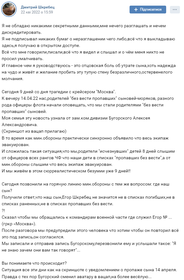 До вечера 22 апреля российские власти не раскрывали информацию, есть ли погибшие в результате затопления крейсера «Москва». Родные моряков, в частности Дмитрий Шкребец начали сообщать о пропавших без вести в социальных сетях.