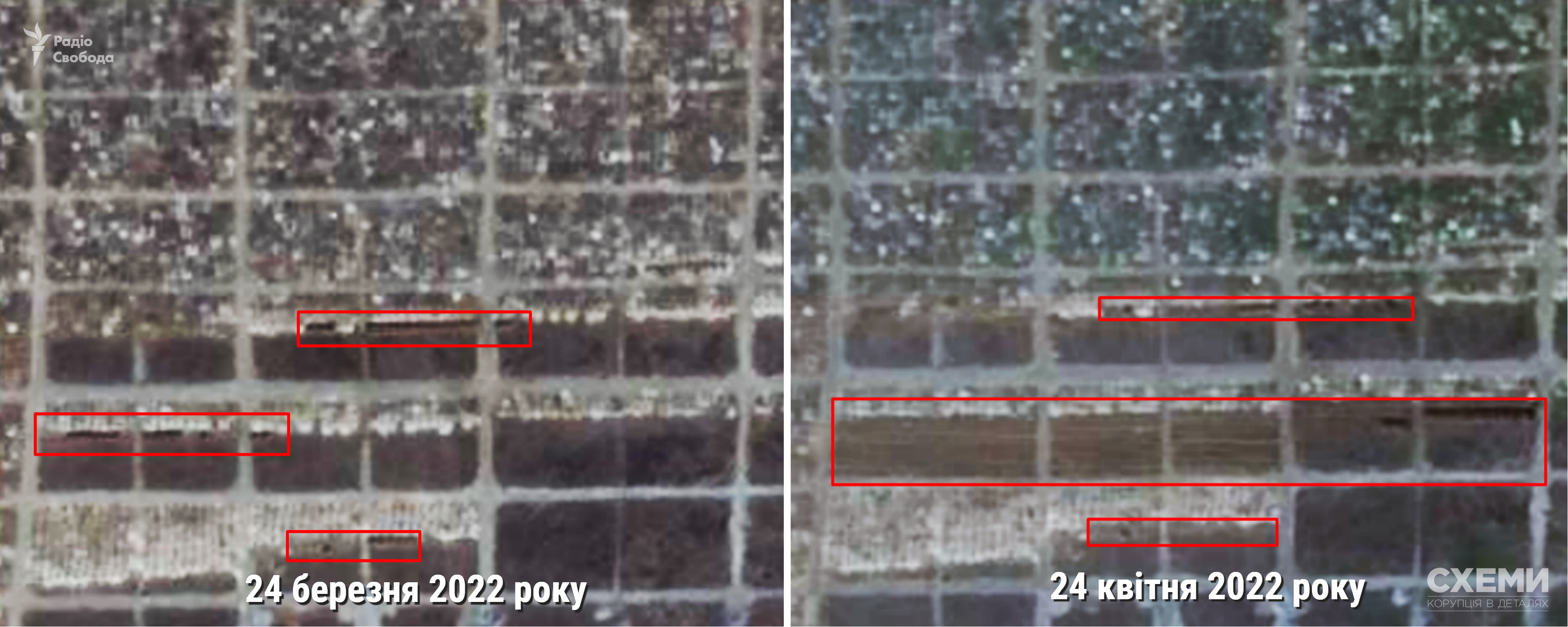 На спутниковом снимке за 24 апреля были зафиксированы новые траншеи. Протяженность места массового захоронения увеличилась до более чем 200 метров.