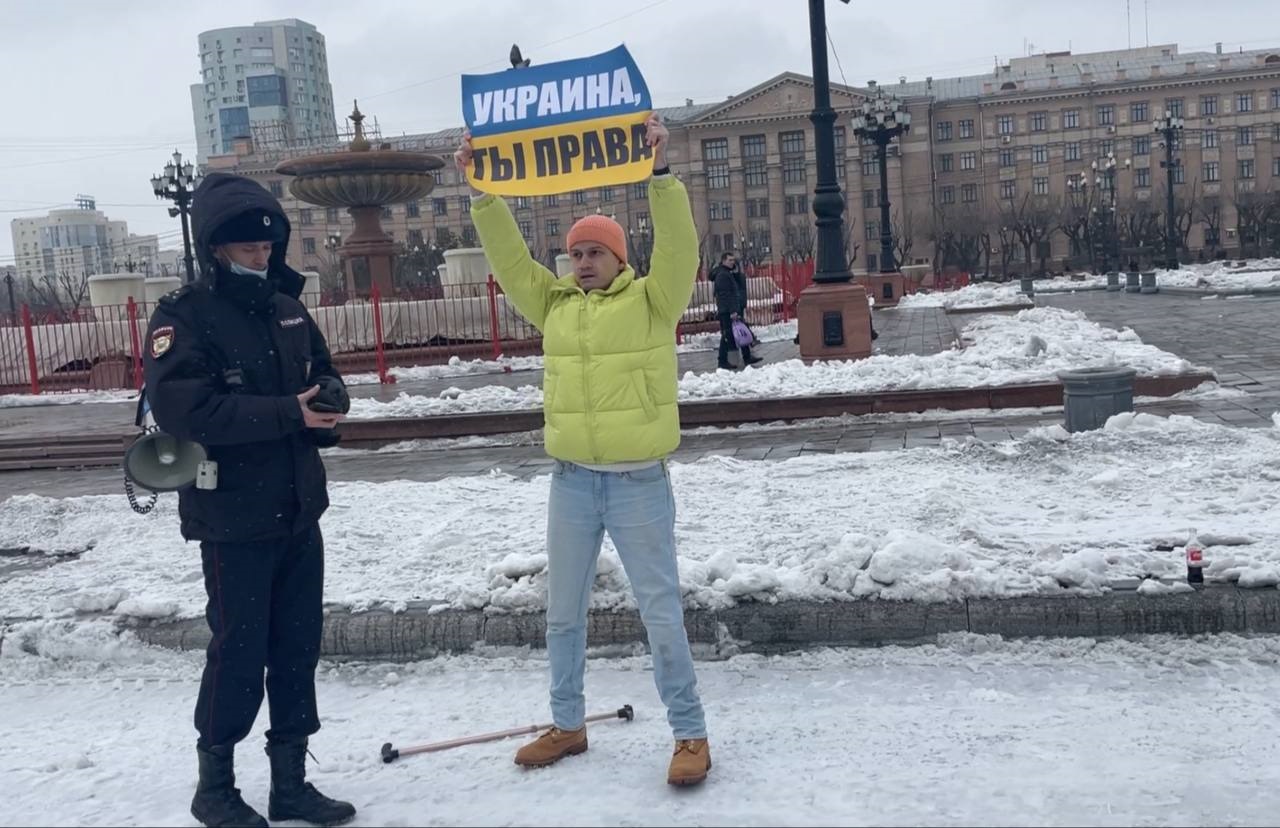 – За мои пикеты, которых было более девяти, на меня составили семь протоколов за нарушение санитарных норм (ст. 20.6.1) и три протокола за "дискредитацию ВС РФ" (ст. 20.3.3). В первые мои выходы полиция вела себя достаточно сдержанно, в Хабаровске полиция вообще мягче по отношению к митингующим, чем в Москве. Полицейские подходили ко мне, вежливо делали предупреждение и давали мне время свернуть плакат и прекратить пикет, и один раз я даже выполнил их требование. Затем, по всей видимости, им спустили указание задерживать пикетчиков более жёстко, и меня стали забирать сразу после того, как я доставал плакат. Поэтому, к сожалению, я не успевал получить реакцию от пpoxoжих – слишком малое время мне удавалось простоять с плакатом. Но мои пикеты снимали независимые СМИ, и именно поэтому о них стало известно. Люди из числа протестующих, которые тоже находились на площади, но не участвовали в пикете, поддерживали меня, кричали слова одобрения и хлопали.