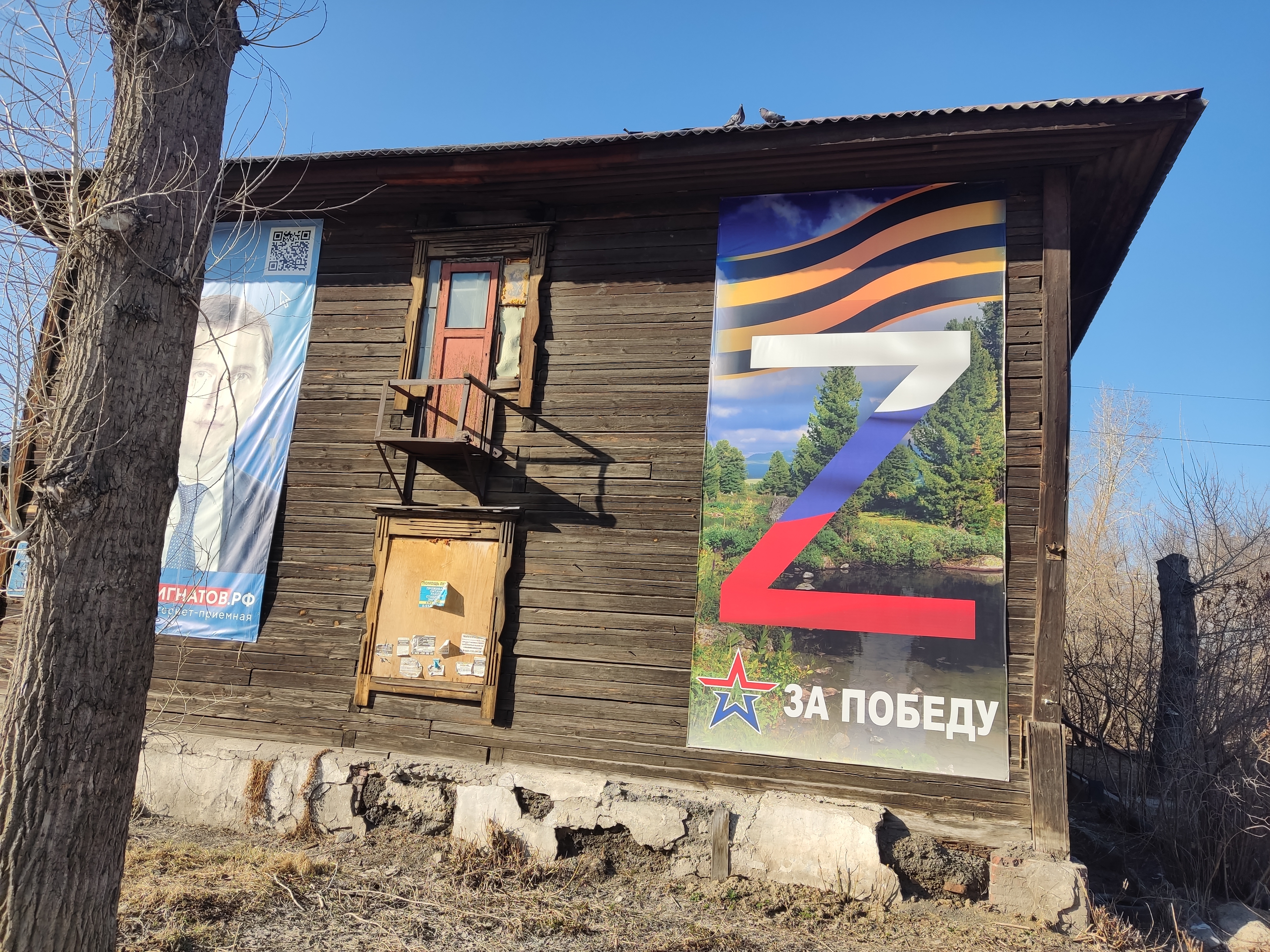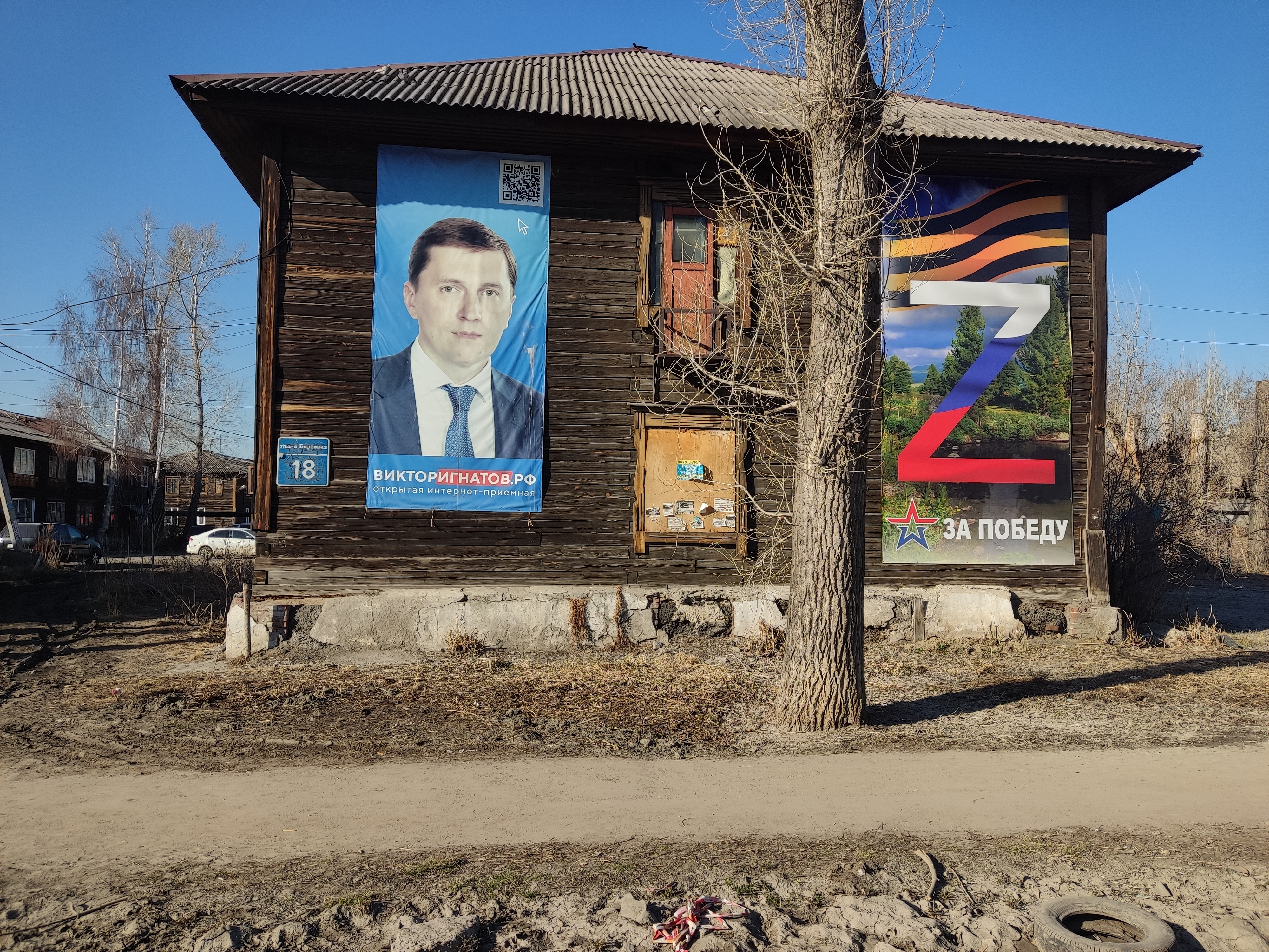 Буква войны появилась на старом ветхом бараке в отдаленном микрорайоне Новосибирска – Затоне. Баннер с лозунгом – "Za победу!" – висит рядом с огромным рекламным плакатом местного депутата, руководителя Сибирского межрегионального координационного совета партии "Единая Россия" Виктора Игнатова.