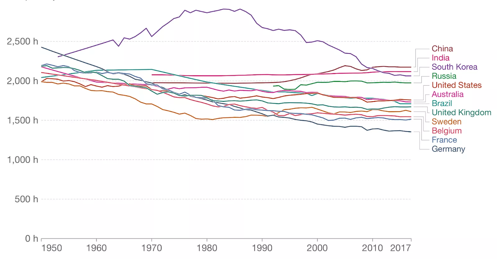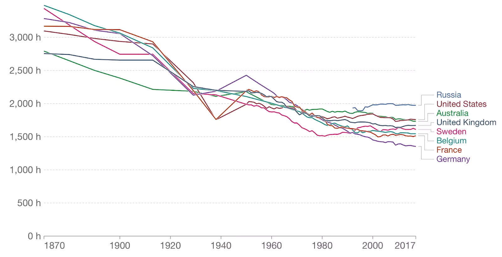 Рабочее время сегодня продолжает сокращаться, но между странами существуют большие различия. Например, в Германии рабочее время резко снижалось с 50-х до сегодняшнего дня, в США же после плавного снижения в 80-х оно стабилизировалось.