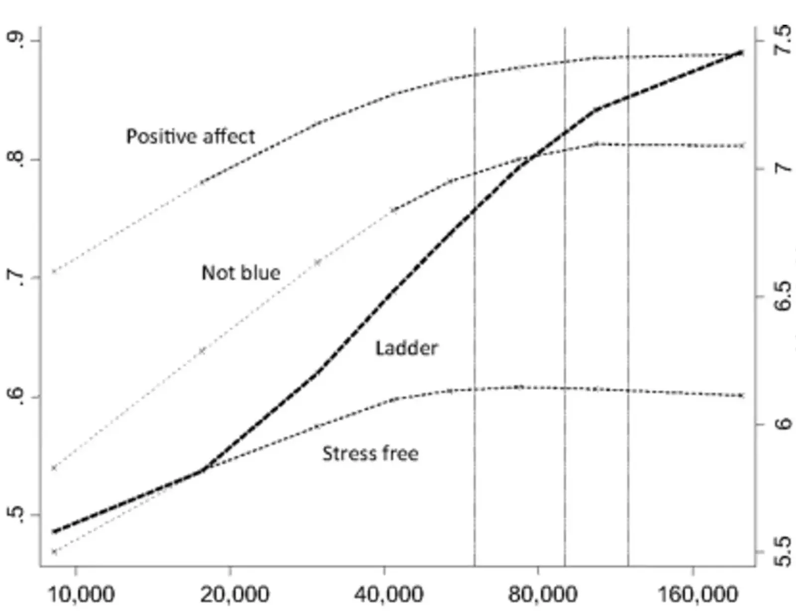 Исследование Эшли Уилланс, доцента Гарвардской школы бизнеса, показало , что подавляющее число работников чувствуют себя удовлетвореннее в жизни, если проводят больше времени с семьей и друзьями. В другом исследовании Даниель Канеман отследил связь дохода, стресса и настроения. Его команда организовала телефонный опрос американцев и на основе ответов составила график в следующих терминах: