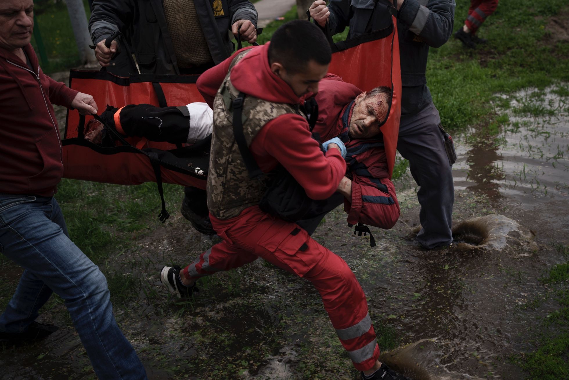 Жители Харькова помогают медику нести пострадавшего при обстреле города