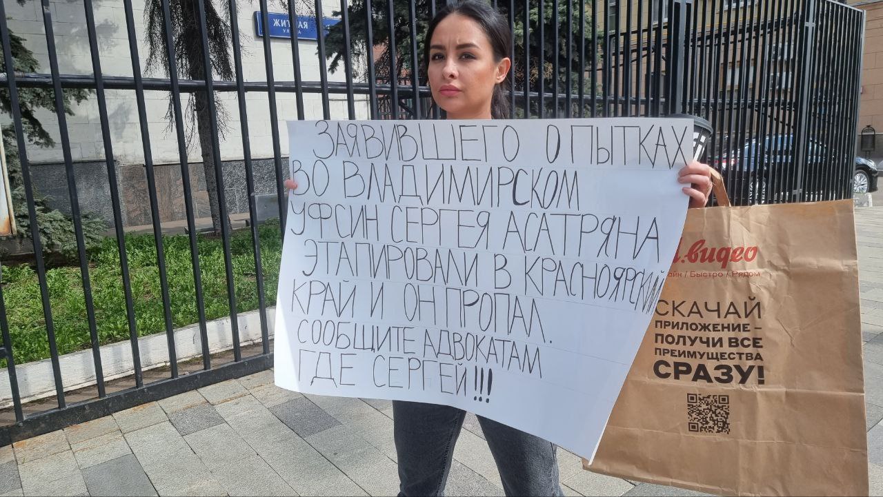 "Заявившего о пытках во Владимирском УФСИН Сергея Асатряна этапировали в Красноярский край, и он пропал. Сообщите адвокатам, где Сергей!" — говорится на плакате родственницы заключенного Хатиджеф Мурадасиловой.