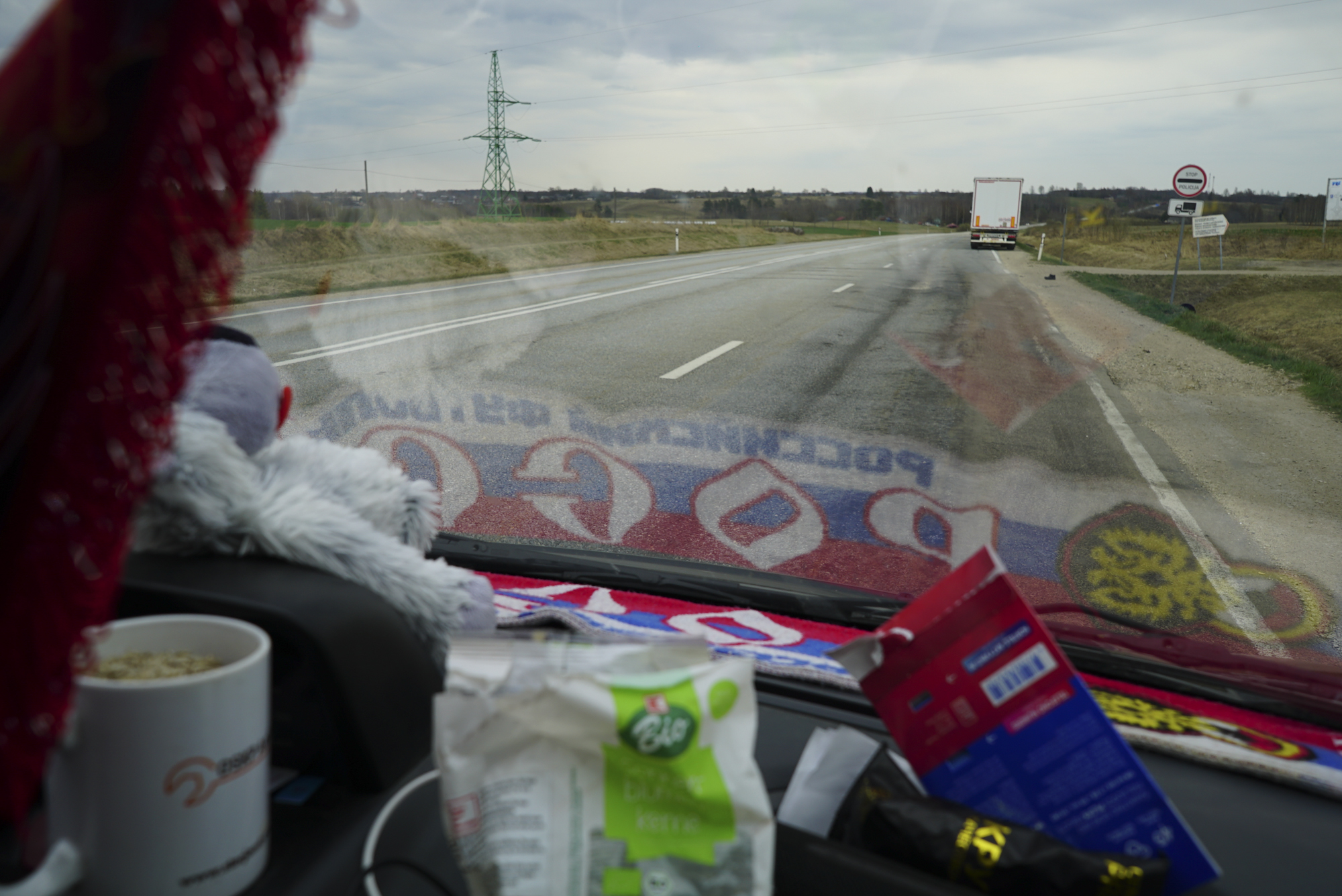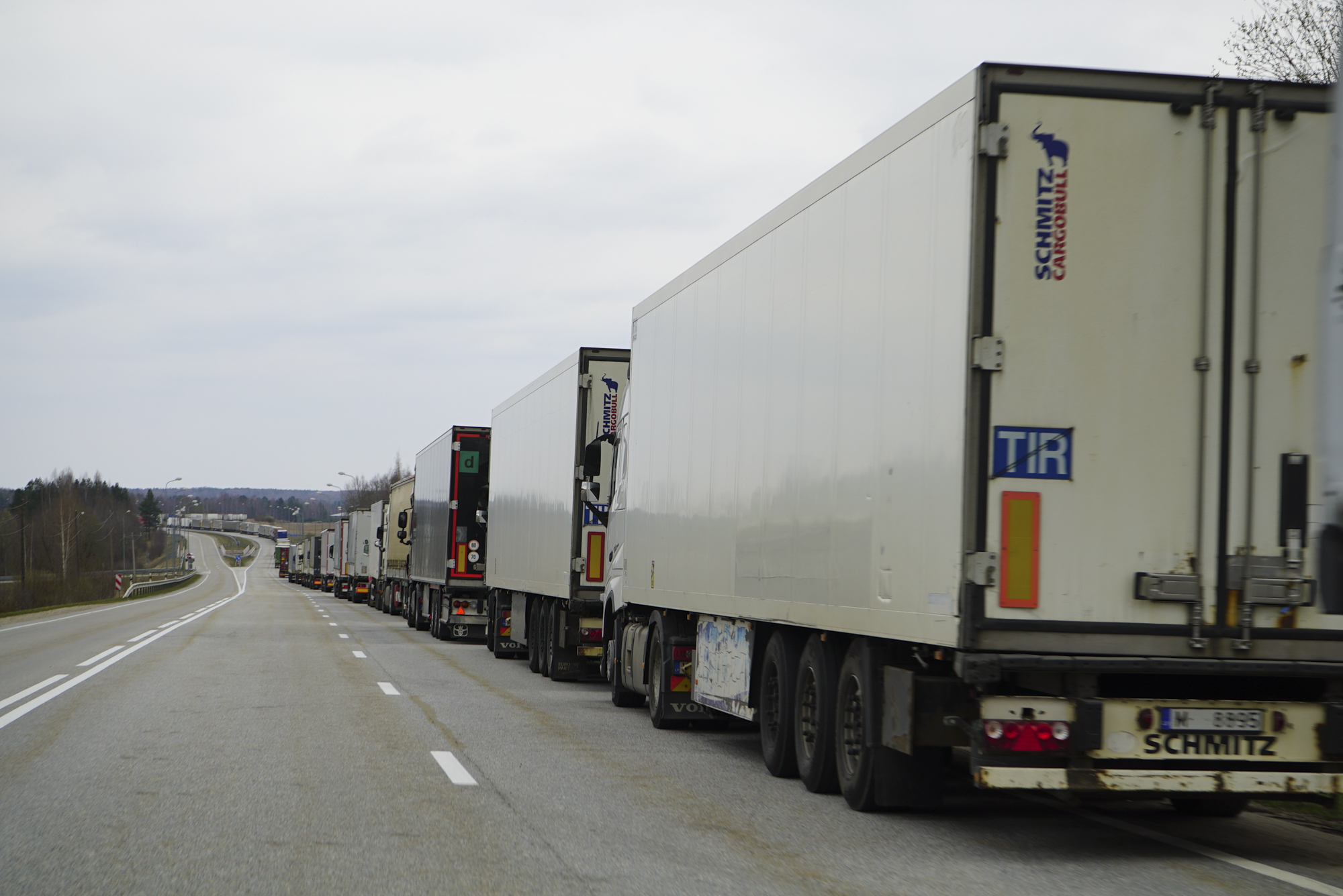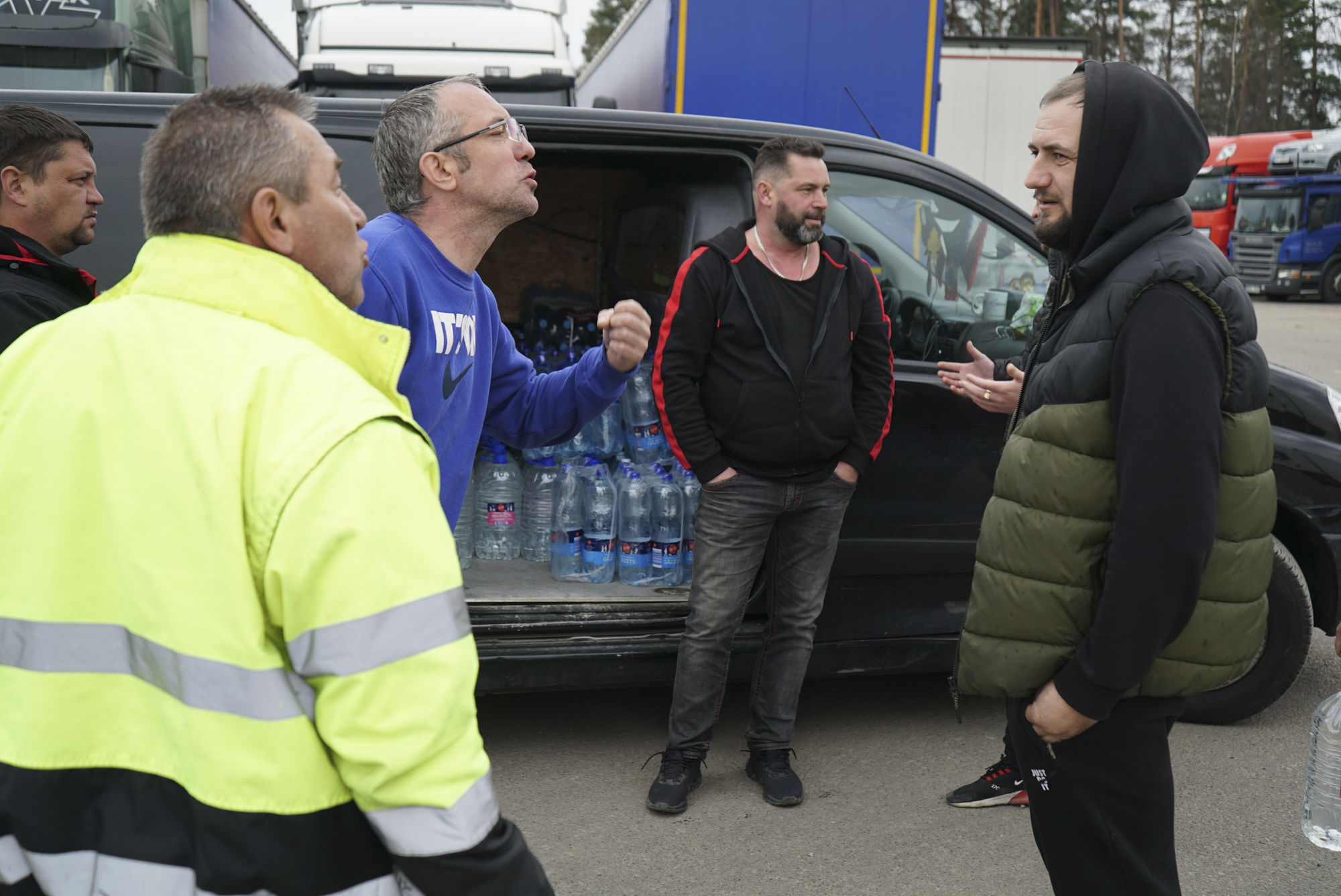 На латышско-российской границе фуры стоят за семь километров до погранперехода Терехово. Николай останавливает свой "бусик" вдоль трассы и предлагает водителям воду и еду, дальнобойщики-латыши в основном вежливо отказываются, россияне и белорусы берут с радостью. На стоянках, где вплотную друг к другу стоят десятки машин, возле "бусика" выстраивается очередь.