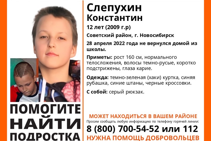 12-летний Константин Слепухин пропал в Советском районе Новосибирска 28 апреля. «Не вернулся домой из школы», — сообщили волонтеры «Лизы Алерт».