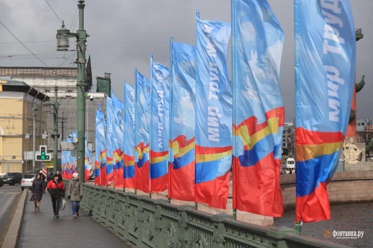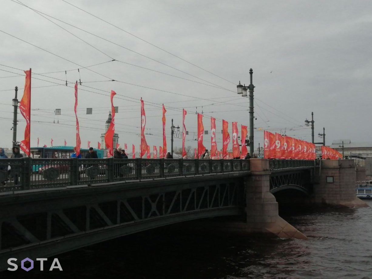 Фотографии флагов на Дворцовом мосту опубликовала в телеграм-канале «Фонтанка», сейчас пост удален. Позднее голубые флаги с надписью «Мир, труд, май» заменили на красные с цифрой девять.