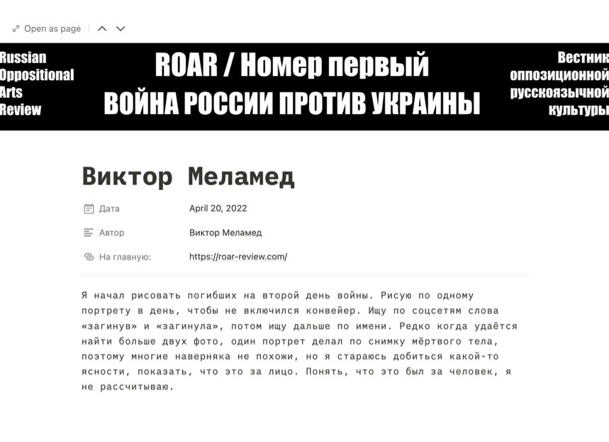— Журнал уже два месяца дает мне почувствовать, что я не бессмысленно существую во всем этом ужасе — в ужасе от того, что происходит в Украине, и от того, что мы наблюдаем сейчас в России и еще будем наблюдать. Я что-то делаю, а не просто сижу и смотрю в монитор, умирая от кошмара. Я умею работать только с буквами и картинками — вот я и работаю с буквами и картинками.