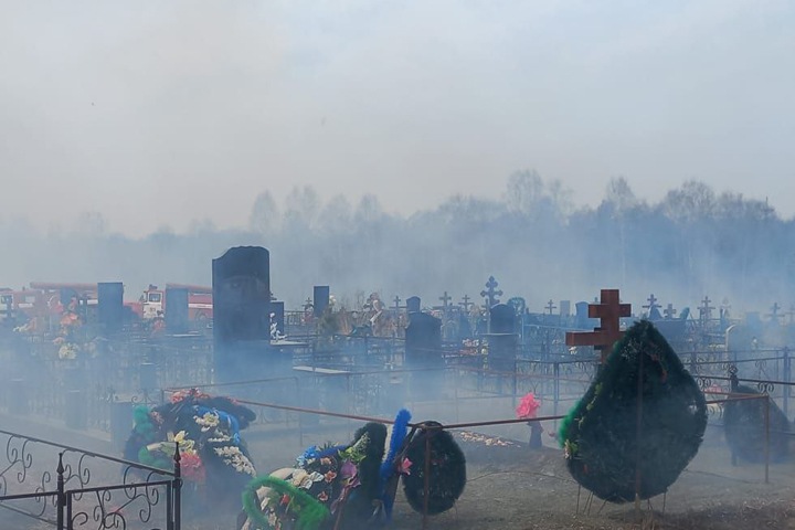 Пал травы перекинулся на кладбище в Красноярском крае. Власти решили провести опашку территории только после инцидента. Фото.