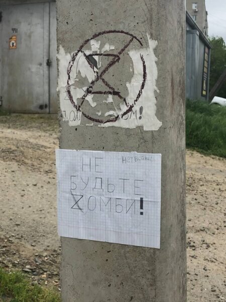 Активисты и действующие члены комитета импровизируют, распространяя обычные листы бумаги содержащие рукописные надписи «Нет войне!» и «НЕ БУДЬТЕ ZОМБИ!»