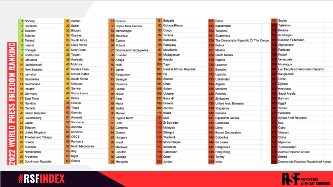 "Репортеры без границ" отмечают, что в 2022 году стало очевидно, что глобализированное и цифровое пространство с ослабленным регулированием, которое способствует распространению пропаганды и ложной информации, привело к информационному хаосу.